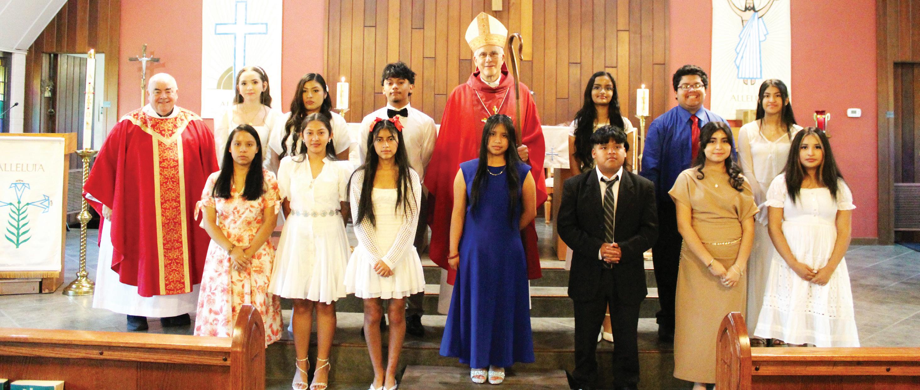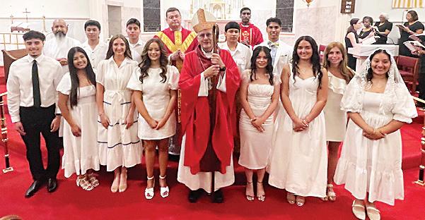 PEARL – St. Jude parish celebrated Confirmation on May 8. Front row, from left: Deacon John McGregor, Father Cesar Sanchez, Katelyn Huerta, Catherine Castillo, Allison Luevano, Kaylie Gonzalez, Mary Lynn Brannon, Mary Adeline Bokros and Deacon Mark Bowden. Second row, from left: Matthew DeOchoa, Cruz Rodriguez, Edwin Juarez, Bishop Joseph Kopacz, Kevin Luevano and Ricardo Juarez. (Photo by Rhonda Bowden)