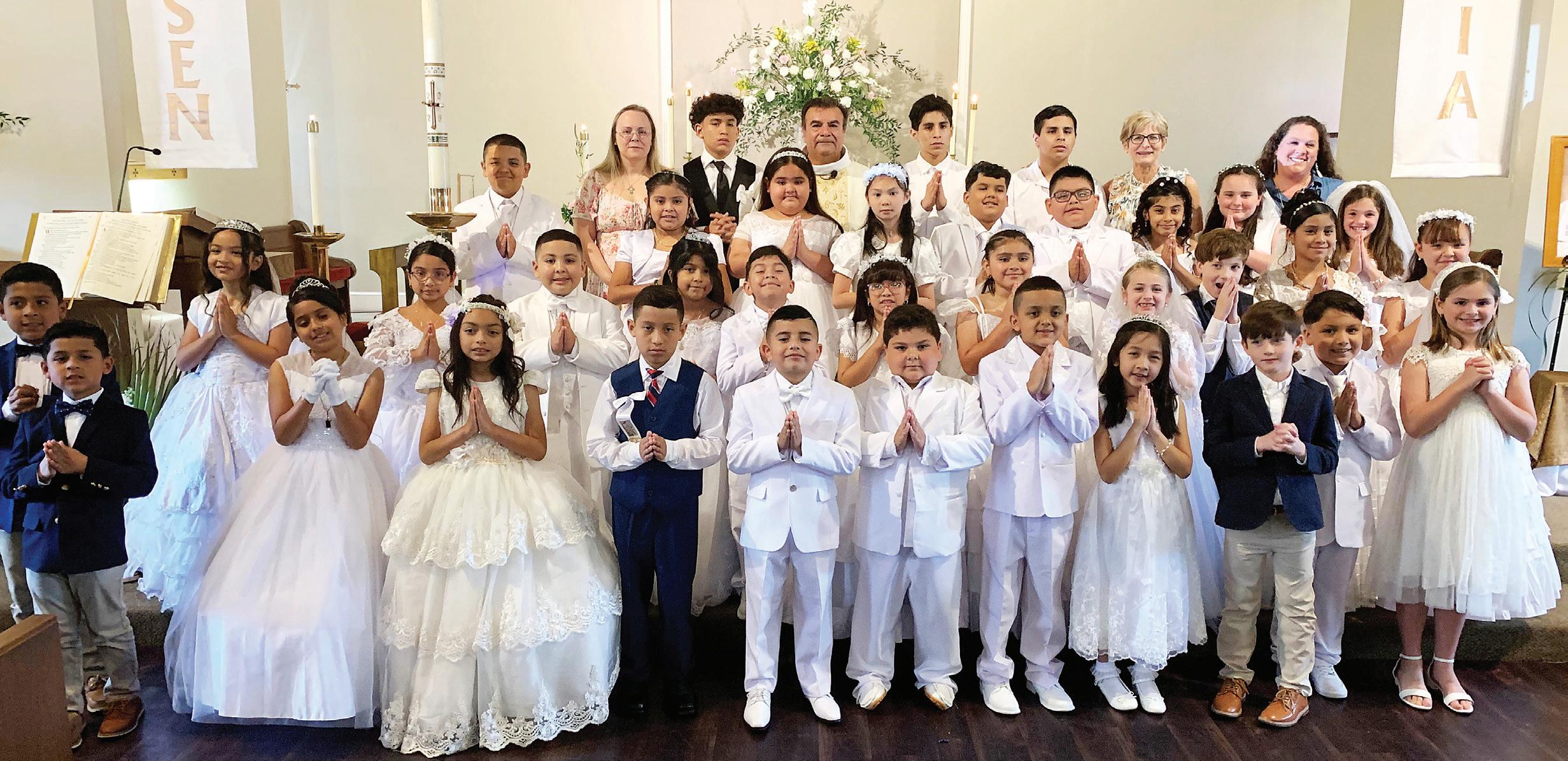 JACKSON – St. Therese parish celebrated first Communion on May 1. Students receiving the sacrament included William Chavez, Maximiliano Arreguín, Angelli Bolaños, Leslie Duarte, Vanessa Vaca, Charito Barrera, Roberto Jacinto-Garcia, Lino Feregrino, Melissa Doiron, Tyler Doiron, Tommy Doiron, Nelly Rosales, Maria J. Flores Pascual, Angelica Bartolome Nicolás, Javier Alexander Mejía, Clarence Ngong, Charis Ngong, Wade Underwood, Steven Trejo, Edward Maya, Alex Mora, Azul López, Alejandro Martínez, Huriel Campusano and Ashley Duarte. Also pictured are teachers Hannah Villasenor, James Villasenor, Jill Hisaw and Ingrid Piernas; Director of Religious Education Mario Villasenor; and celebrants Bishop Joseph Kopacz and Father Stephen Okojie. (Photo by Mario Villasenor)