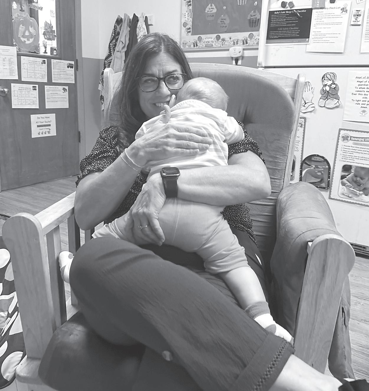 FLOWOOD – Joni House, executive director of the Office of Catholic Education for the Diocese of Jackson, spends a few moments cuddling a baby at St. Paul Early Learning Center while visiting schools in the Jackson area on Thursday, Oct. 2. House stepped into the role following the retirement of longtime Catholic educator and diocesan schools director Karla Luke at the end of September. (Photo courtesy of Joni House)