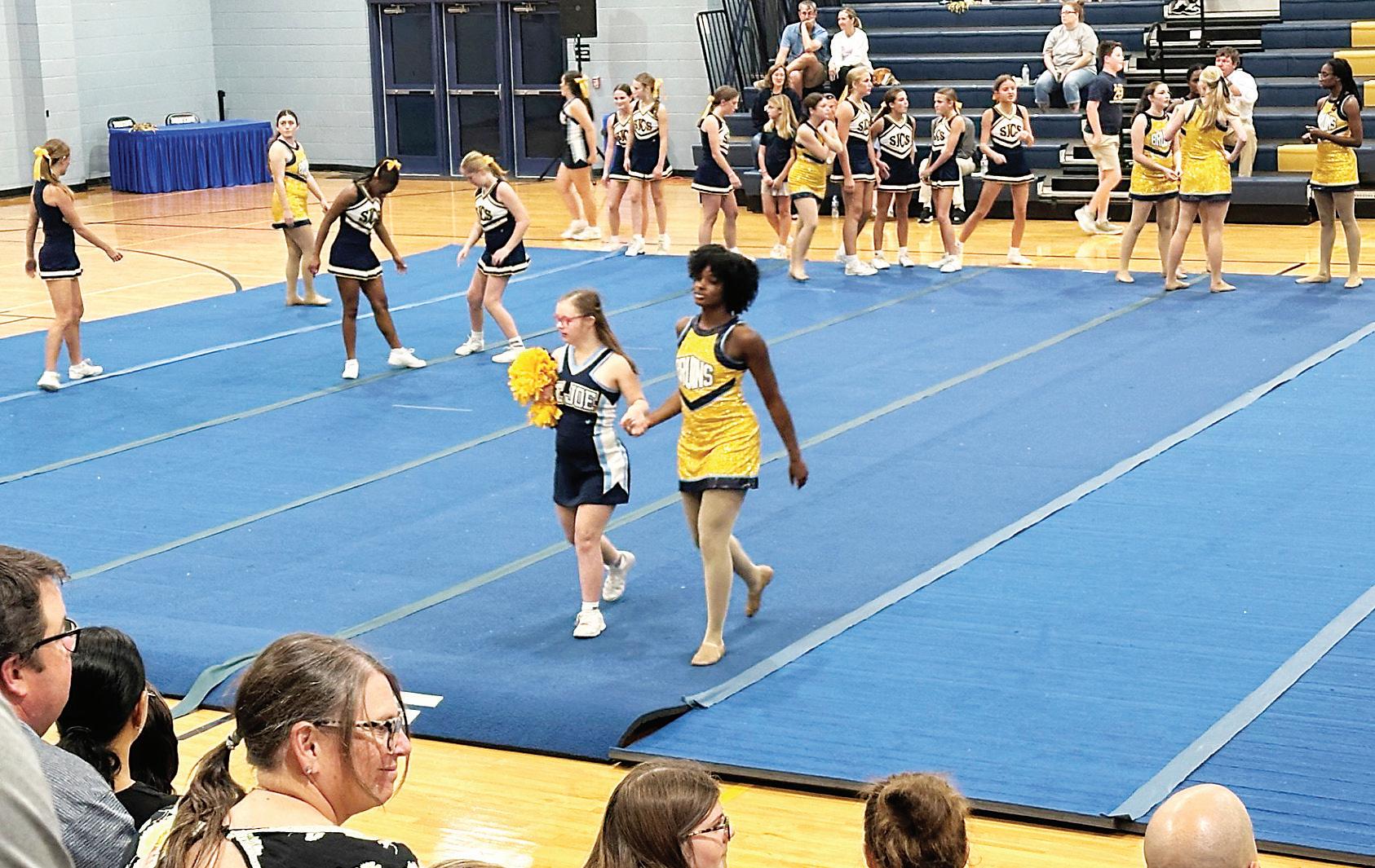 MADISON – St. Joseph Catholic School Spirit Stepper Michael Michelle and Lady Bruins cheerleader JoJo take the floor during the school’s “Meet the Bruins” event on Sept. 24. Spirit Steppers and cheerleaders performed together to kick off the fall sports season.