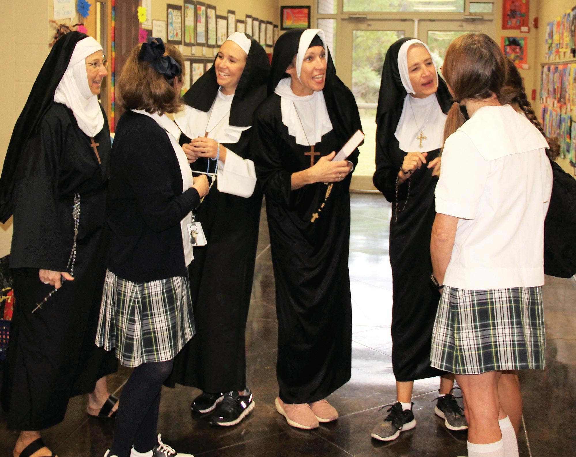 MADISON – St. Anthony School celebrated Halloween by incorporating Catholic school sym bols. Principal Anne Cowger, Katie Loyacano and Celeste Tassin, dressed as students, chat with the fifth and sixth grade sisters/teachers on Halloween. (Photo courtesy Bridget Moore head)