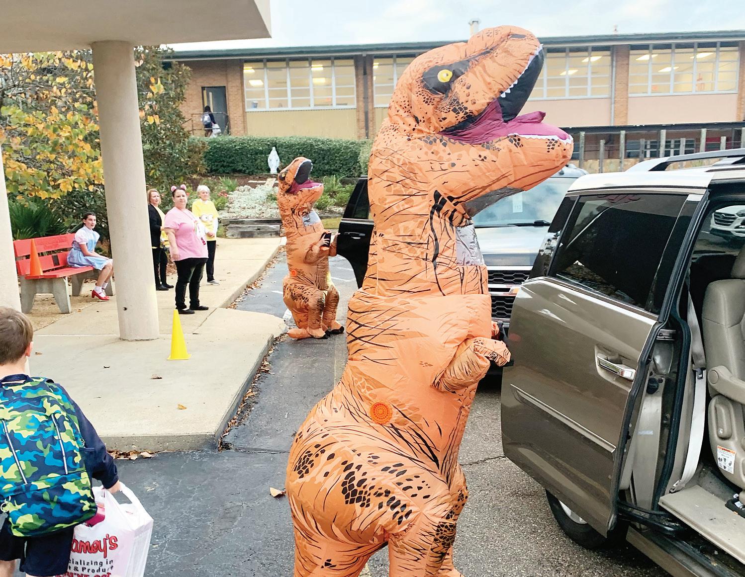 JACKSON – St. Rich ard sixth grade student dressed as T-Rexes greet students on Monday, Oct. 31. (Photo by Shea Luckett)