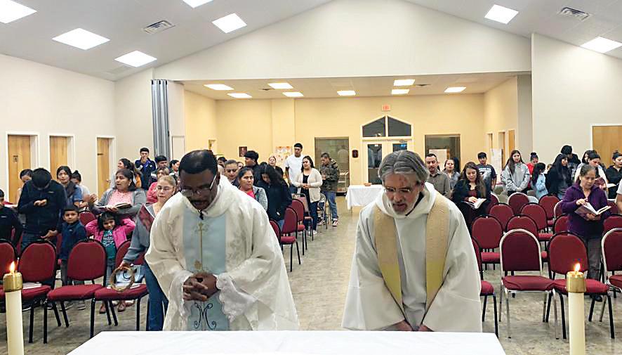 GLUCKSTADT – Bishop Joseph Kopacz and Father Ajani Gibson administer Communion during the Eucharistic Revival moment held at St. Joseph parish in Gluckstadt. The two day event was a part of the National Eucharistic Revival featuring adoration, vespers, spiritual talks on the Eucharist, opportunities for reconciliation and Mass. (Photo by Joanna Puddister King)