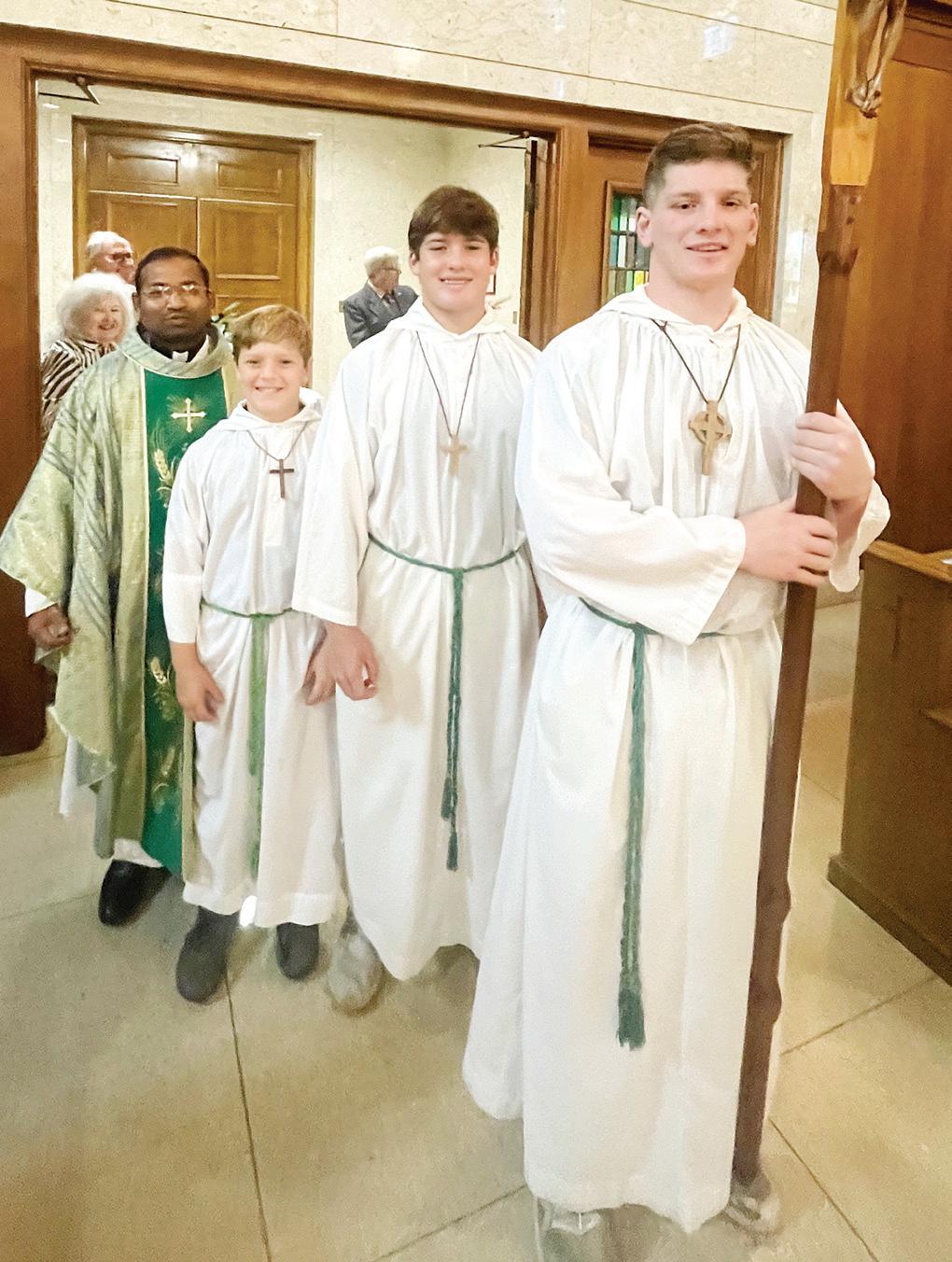 CLARKSDALE – The three Stonestreet brothers served as altar servers at Mass at St. Elizabeth par ish. Sam (senior), Harris (eighth grade) and Michael Stonestreet (fifth grade) are pictured with Father Raju. (Photo by Mary Evelyn Stonestreet)