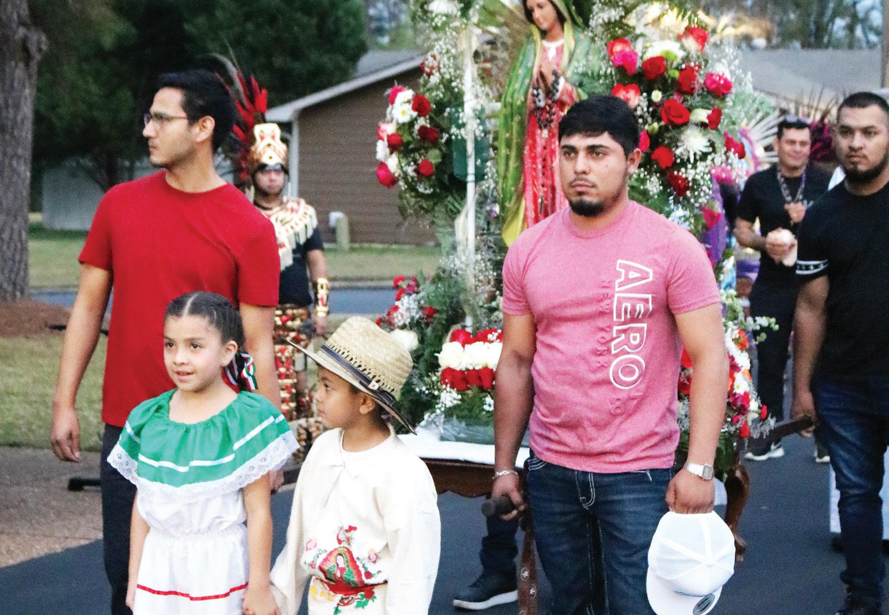 PEARL –St Jude parish held their first Guadalupe procession on Saturday, Dec. 10. Altar servers, Thomas, Dori Pazcak and Olinsar Villafranca are pictured. (Photo by Tereza Ma)
