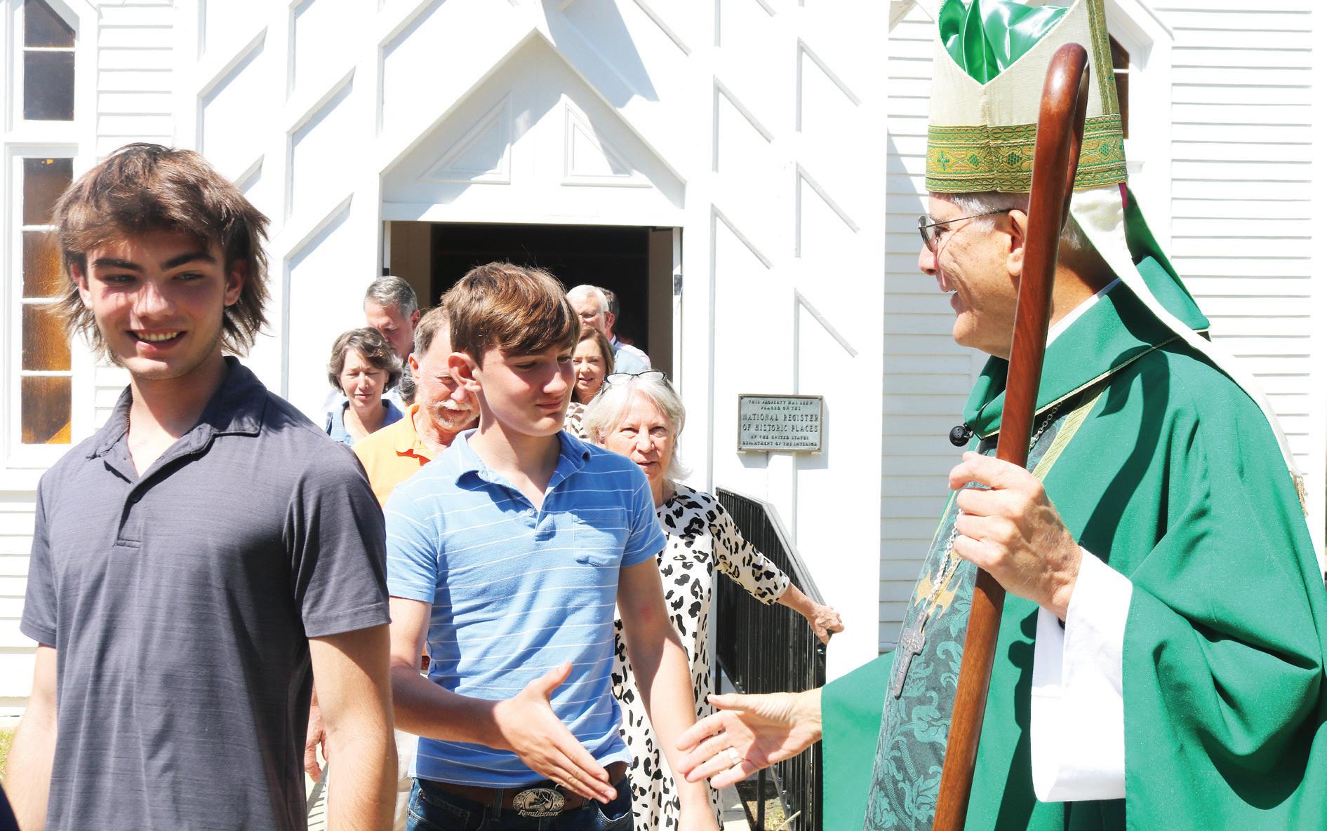 WOODVILLE – Samuel Bray reaches in for a hand shake hand with Bishop Joseph Kopacz after a Mass celebrating the 150th anniversary of St. Joseph parish. Also pictured is Spencer Bray.