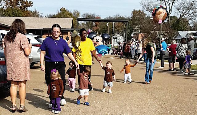 VICKSBURG – At the Sisters of Mercy Early Learning Center’s annual Balloon Parade, teachers Alexa Eb and Marisha Davis walk with one-year-old students Millie Moody, Beau Brock, Anderson Parker and Ryland Miller. James Hyland is pictured at right with his mother, Liz Hyland. (Photo by Shannon Bell)