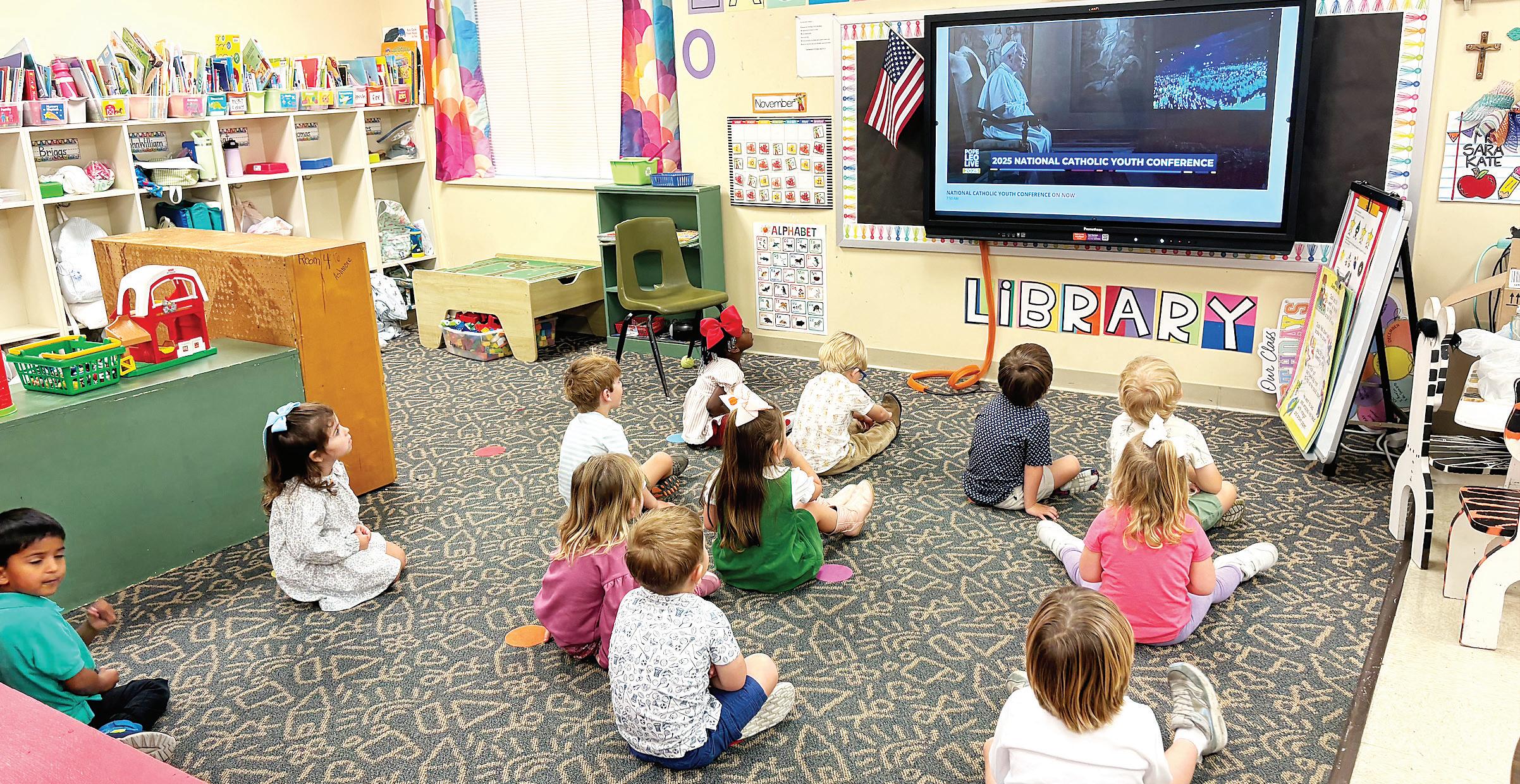 CLARKSDALE – Young students at St. Elizabeth School watch as Pope Leo XIV connects with youth around the world during a live digital encounter at NCYC. Teachers noted how impressed they were by the attentiveness of even the youngest learners. (Photo courtesy of St. Elizabeth School)