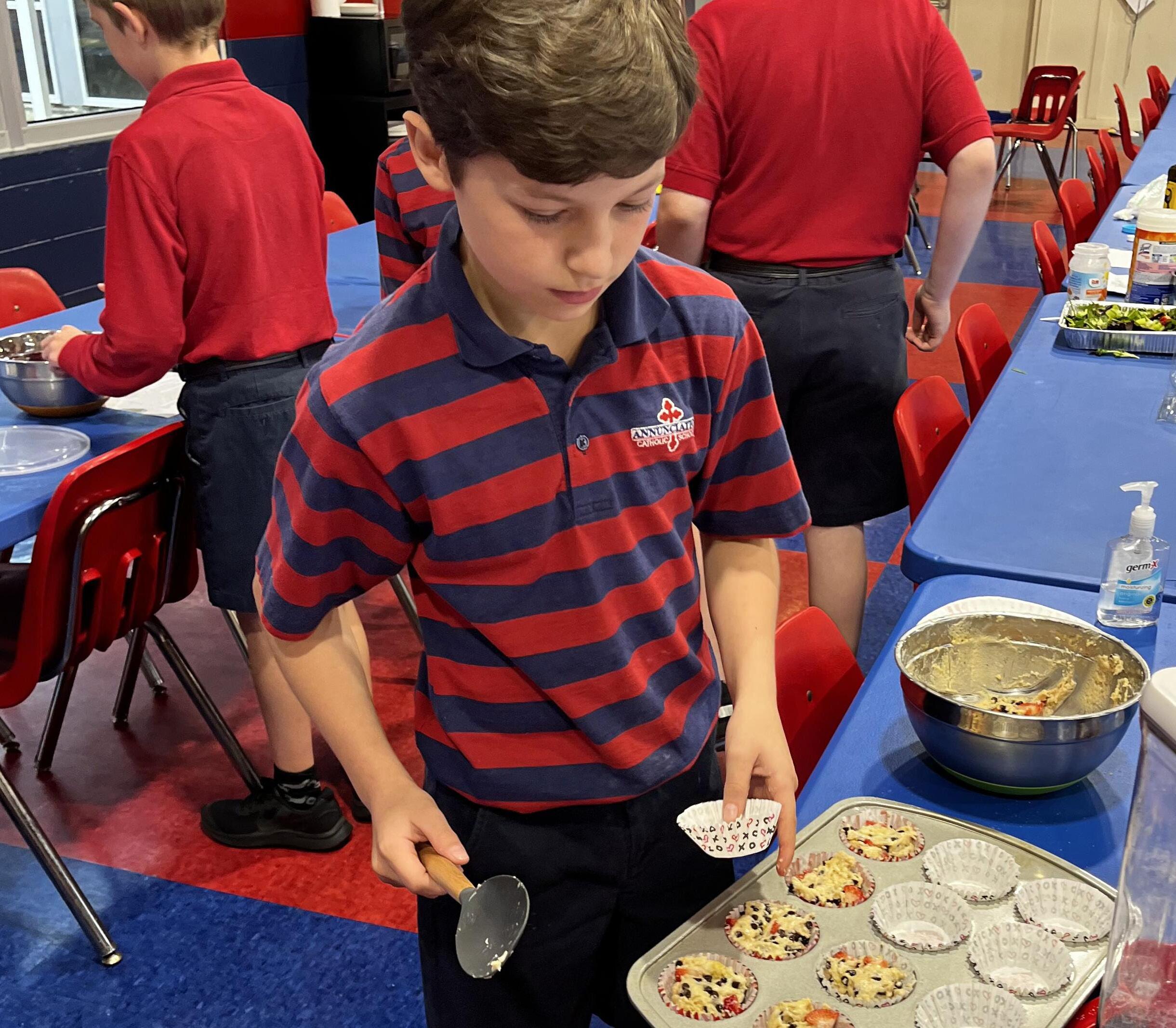 COLUMBUS – Annunciation fifth grade students cook with Mrs. Cancellare in S.T.R.E.A.M. Class. Pictured: Above, Preston Dimino scoops batter into baking cups. On right, Annabelle Brislin puts the final touches on her strawberry bruschetta. (Photos by Logan Waggoner)