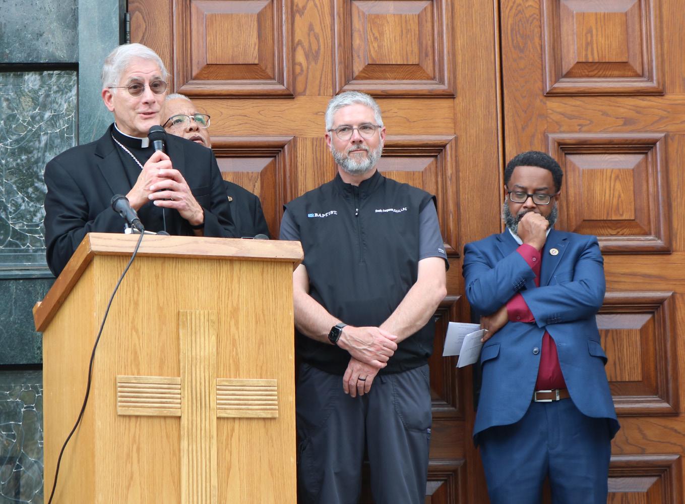 JACKSON – Bishop Joseph Kopacz and other faith leaders gathered at a press conference offering their support of the extention of postpartum coverage for Mississippi mothers on Monday, Feb. 27 at the Cathedral of St. Peter the Apostle. (Photo by Tereza Ma)