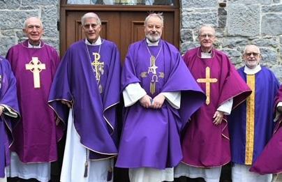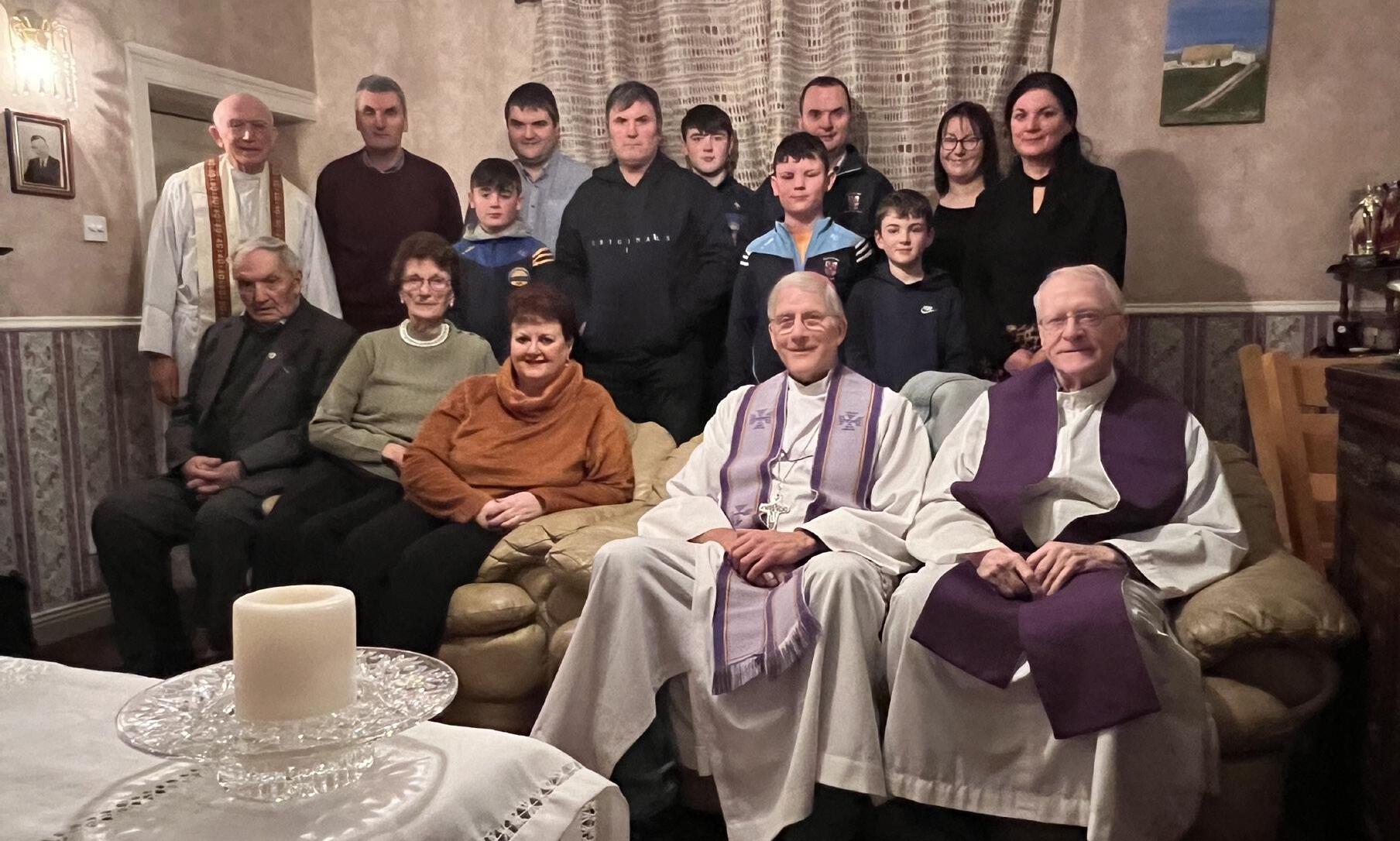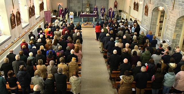 Some traveled for over two hours to be together and to give thanks to the Lord for the gifts of family, faith and priesthood. The accompanying Mass photos illustrate a full church and the concelebrating clergy. At the altar from left to right is Father Douglas John Zaggi, pastor, Msgr. Elvin Sunds, Father Louis Lohan, myself, Bishop Kevin Doran, the Ordinary of the Diocese of Elphin, Father Mike O’Brien and Father P.J. Curley.