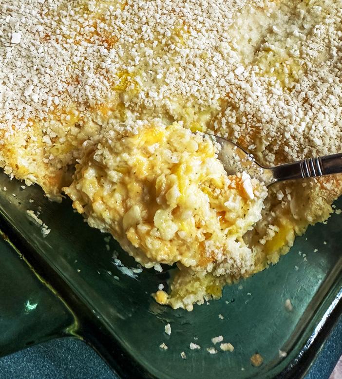 Preheat oven to 350 degrees. Dice, cook, drain and lightly mash squash. Mix all ingredients, except bread crumbs, and place in a 9x9 dish. Sprinkle breadcrumbs on top. Bake in oven for 30 minutes.