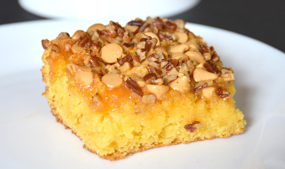 Preheat oven to 350 degrees. Place pudding mix and milk in a large mixing bowl and blend according to the package directions. Fold in the dry cake mix and stir until the batter is combined, although still a little lumpy. Pour the batter into a 9x9 sprayed pan and smooth the top with a rubber spatula. Scatter the butterscotch chips on top of the batter, then sprinkle the pecans on top of the chips. Bake 35-40 minutes.