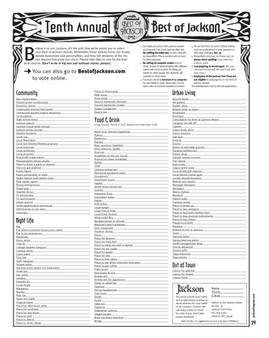 HOLHYH LW RU QRW -DFNVRQ LW¶V WKH WK WLPH ZH¶YH DVNHG \RX WR VHOHFW \RXU %HVW RI -DFNVRQ FKRLFHV 5HPHPEHU WKHVH DZDUGV KRQRU RXU ORFDOO\ RZQHG EXVLQHVVHV DQG SHUVRQDOLWLHV DQG WKH\ WHOO UHVLGHQWV RI WKH FLW\ DQG EH\RQG KRZ JUHDW RXU FLW\ LV 3OHDVH WDNH WLPH WR YRWH IRU WKH EHVW ORFDO FKRLFHV 'RQ·W ZULWH LQ ELJ ER[ DQG QDWLRQDO FKDLQV SOHDVH