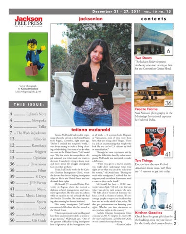 tatiana mcdonald at all levels. ... If a person looks Hispanic or Vietnamese, even if they were born here, they are being called ‘illegals.’ There is a lack of understanding that people who look like me can be U.S. citizens by birth or naturalization.” Through her own experiences and by seeing the difficulties faced by other immigrants, McDonald was motivated to make a difference. “When you get to a (new) country, you really don’t understand what your rights are or what you can do to make your life normal,” McDonald says. “During my work with immigrants, I realized that immigrants, with or without documents, need a voice, so they can be heard.” McDonald has been a CCIC caseworker since April. “My job is to find out what I can do for each person,” she says. “We help a lot of victims of domestic violence as well as victims of crimes. We encourage people to report any incident they have and to not be afraid of the police. We also give presentations on knowing your rights. Whether you have documents or not, you have rights in this country.” Catholic Charities Immigration Clinic is located at 200 N. Congress St., Suite 100. For more information, call 601-948-2635, or visit catholiccharitiesjackson.org. —Dustin Cardon