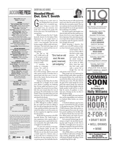 rowing up on a quiet street in the Hanging Moss area of north Jackson was a wonderful experience. Living on a street with moss-draped trees, my memories were made more colorful by the people who lived on that street. The Smith family was among them. Before he became Det. Eric T. Smith, homicide detective for the Jackson Police Department, he was simply known as “The Twin.” Eric and Cedric Smith—the “twins”—were inseparable. They were fun loving, energetic, athletic, polite and somewhat quiet. They both had a large circle of acquaintances in school and they were often a two-for-one friendship package. Eric had an “old soul,” as folks used to call it. He was quiet; reserved, yet outgoing; and tactful, yet honest. People looked to him as a leader. I remember his mother as a statuesque woman. You could always count on seeing her at PTA meetings, athletic events and other school activities. If mothers have a special bond with their sons, it was evident in Mrs. Smith. Her love for her children was undeniable. During our school days, Eric was often noticeably lost in thought, but he would never disclose if anything was bothering him. He just smiled and moved on to another subject. Eric seemed to be one of those kids who never stressed about the woes of growing up. He and his brother were model students, always respectful of their peers and instructors. Eric was loved by his teachers and adored by his friends. Eric served in the U.S. Marine Corp after graduating from Callaway High School in 1990. Although he excelled in military life, you would never know by talking to him. Eric did not brag about his time in the Corps, and did not look for a hero status. He entered the military to serve his country, not for the recognition he might have received from his position. Shortly after his promotion to the JPD homicide division, Det. Smith became a close acquaintance with a superior officer. I had the opportunity to speak with Eric’s former commander, who spoke fondly of Eric as though he were still with us. “I’ve never seen someone as even-tempered as Detective Smith,” he said. “He was level headed and always the same way. Whether you saw him after he just arrested a murder suspect for a heinous crime, or he was on the way to a restaurant to eat, he would have the same expression. Eric was a very private person. You could talk to him for