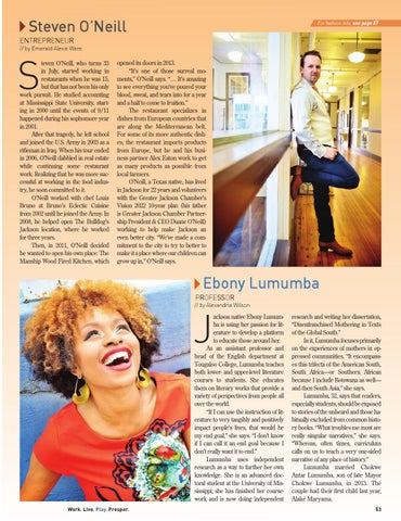 research and writing her dissertation, “Disenfranchised Mothering in Texts of the Global South.” In it, Lumumba focuses primarily on the experiences of mothers in oppressed communities. “It encompasses this trifecta of the American South, South Africa—or Southern African because I include Botswana as well— and then South Asia,” she says. Lumumba, 32, says that readers, especially students, should be exposed to stories of the unheard and those habitually excluded from common history books. “What troubles me most are really singular narratives,” she says. “Whereas, often times, curriculum calls on us to teach a very one-sided narrative of any place of history.” Lumumba married Chokwe Antar Lumumba, son of late Mayor Chokwe Lumumba, in 2013. The couple had their first child last year, Alaké Maryama. 53