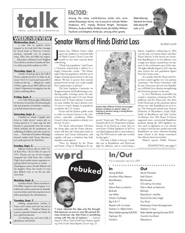 district. Legislative redistricting in 2002 cost the state one Senate district and three House districts. It also forced two incumbent Republicans to vie for influence over a single new district created from two districts in the northeastern part of the state. The fight officially begins in 2011 after the state receives the new population figures from the Census count. As it stands, both the House and Senate have tossed together two very partisan committees. The House Committee, with its nine Democrats and one lone Republican, will likely favor districts strengthening the Democrat presence in the state. Lt. Gov. Phil Bryant, meanwhile, has created a committee consisting of five Republicans and five Democrats—but three of the Democrats on the committee almost always vote with Republicans on every issue. The Democrats include Sens. Tommy Dickerson of Waynesboro, Cindy HydeSmith of Brookhaven and Jack Gordon of Okolona. Sen. Hob Bryan, D-Amory, supported some controversial Republican positions during the 2009 legislative session, such as opposition to a tax increase on tobacco, but has since parted ways with Republicans on some education-funding issues. Frazier is the Senate committee’s lone African American member. Political reporter Bobby Harrison REDISTRICTING, see page 7