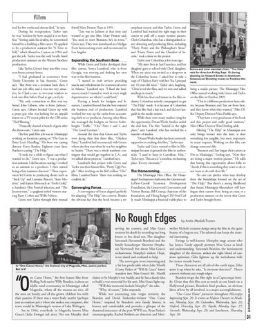 No Rough Edges serving his country, and Miss Grace mourns his death by scrawling out long letters to her dead son. Her daughter Savannah (Savannah Bearden) and the family housekeeper Sherrene (Stephanie Norwood) fret about Miss Grace’s reclusiveness. Murphy’s widow, Hope, is too dazed and confused to help. The movie gets more interesting and a bit less predictable when John Mazilli In “One Came Home,” the fictional city of Magnolia, Miss., seems perfect. But is it? (Corey Parker of “Will & Grace” fame) wanders into Miss Grace’s life. Mazilli ne Came Home,” the first feature film from claims to be Murphy’s war buddy, and he has a dandy idea Rolling Fork native Willy Bearden, is about an to build a war memorial for his unit. Miss Grace lights up. idyllic rural community in Mississippi called “Will this memorial include Murphy?” she asks. Magnolia, where all the mamas are nice, all “Why, of course,” John responds. the men are handy, and all the grown children live with While not journeying into virgin territory, the their parents. If there was a water body nearby (perhaps Bearden and David Tankersley-written “One Came just an outdoor privy where the snakes run rampant), this Home,” inspired by Bearden’s own family history, is town would be Mississippi’s version of Lake Wobegon. homey and comfortable and provides a glimpse of the Set in 1946, everybody in Magnolia knows Miss shattered innocence of the post-WWII era. Ryan Parker’s Grace’s (Julia Ewings) sad story. Her son Murphy died cinematography, Rachel Bolden’s art direction and Meri-