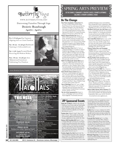 established Mississippi artisans with disabilities. Show includes silent auction, refreshments, raffles and live entertainment. Proceeds benefit Life of Mississippi. $15, $25 for two; call 601-201-6735. McAllister’s Deli Tea for Tots Golf Classic April 8, 8 a.m., at Annandale Golf Club (419 Annandale Parkway, Madison). An 18-hole golf tournament, tea party, performance by the Bells of Faith and more. Proceeds benefit The Mustard Seed. $1000 team, $10 tea party; call 601-992-3556. Sante South Wine Festival April 9, 7 p.m., at The South (627 E. Silas Brown St.). More than 30 vintners of fine wines will offer samples. Food, live music and a silent auction are also included. Proceeds benefit the Alzheimer’s Association of Mississippi. $70; call 601-987-0020. Ultimate Fashion Show and Champagne Luncheon April 11, 11 a.m., at Country Club of Jackson (345 Saint Andrews Drive). Show features spring fashions. Proceeds benefit the Diabetes Foundation of Mississippi’s Camp Kandu program. $50; call 601-957-7878. Planting Healthy Seeds and Deeds April 16, 8:30 a.m., on the corner of Medgar Evers Boulevard and West Northside Drive near the BP station. Jackson Inner-City Gardeners plant an organic vegetable spring garden as part of Global Youth Service Day. Bring gloves, shovels and rakes. E-mail tre.roberts@jiggarden.org. Dress for Success Power Walk May 7, 8 a.m., at Courthouse Racquet and Fitness Club, Northeast (46 Northtown Drive). Registration starts at 6 a.m. Proceeds benefit Dress for Success Metro Jackson. Visit dfspowerwalk.org/jackson to register, form a team or be a virtual walker. $20-$30; e-mail jackson@dressforsuccess.org. Blondes vs. Brunettes May 14, 2 p.m., at Millsaps College (1701 N. State St.). Two teams of women—blondes and brunettes—compete in a powder-puff football game. Proceeds benefit the Alzheimer’s Association. $25; for details, e-mail elizabethmhamilton@hotmail.com. Jackson Public Schools Call for Volunteers. JPS seeks volunteers from the community to be mentors for seniors enrolled in the Advanced Seminar: Employability Skills course. Call 601-960-8310. See and add more events at jfpevents.com. ily carnival at 10:30 a.m.; a gospel tent at noon; and the Zippity Doo Dah Parade at 6:30 p.m. featuring the Sweet Potato Queens and the Magnolia Roller Vixens. The Mustard Seed will also have a ceramics show at The Cedars each day. Call 601-981-9606. ZooBrew May 13, 6 p.m., at Jackson Zoo (2918 W. Capitol St.). Enjoy beer and wine samplings, specialty food, live music and other activities. For ages 21 and older. Ticket price TBA; call 601-3522580, ext. 228. Crossroads Film Festival April 1-3, at Malco Grandview (221 Grandview Blvd., Madison). Dozens of independent films are shown during the three-day festival along with music events and workshops. More details coming soon. $5-$55; email coord@crossroadsfilmfestival.com. Arts, Eats and Beats April 14, 5 p.m. Fondren’s spring arts celebration showcases Jackson’s best in art, antiques, gifts, apparel, interior design, furniture, food and music. Free; call 601-981-9606. Mississippi Happening. Guaqueta Productions hosts the monthly broadcast featuring a special musical guest. Download free podcasts at mississippihappening.com.