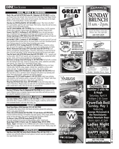 BARS, PUBS & BURGERS Brady’s Bar and Grill (6720 Old Canton Rd., Ridgeland, 601-812-6862) Everything you’d expect from a bar and grill, from classic pub fare to their Krispy Sweet Pepper Chicken. Burgers, seafood baskets, salads, steaks and lunch specials. And, ladies get one free Apple Martini or Cosmo during Brady’s Thursday Ladies Night! Cherokee Inn (960 Briarfield Rd. 601-362-6388) Jackson’s “Best Hole in the Wall,” has a great jukebox, great bar and a great burger. Plate lunches, cheesy fries and tons more, including a full bar and friendly favorites. Cool Al’s (4654 McWillie, 601-713-3020) A Best of Jackson fixture, Cool Al’s signature stacked, messy, decadent, creative burgers defy adjectives. And don’t forget the fries! Fenian’s Pub (901 E. Fortification St. 601-948-0055) Classic Irish pub featuring a menu of traditional food, pub sandwiches and beers such as Guinness and Harp on tap. Stamps Superburgers (1801 Dalton Street 601-352-4555) Huge burgers will keep you full until the next day! The homestyle fries are always fresh. Hal and Mal’s (200 S. Commerce St. 601-948-0888) Pub favorites meet Gulf Coast and Cajun specialties like red beans and rice, the Oyster Platter or each day’s blackboard special. Best of Jackson winner for Live Music Venue for multiple years running. Last Call (3716 I-55 N. Frontage Road 601-713-2700) Burgers, sandwiches and poboys, plus sports-bar appetizers and specialities. Pay-per-view sporting events, live bands. Martin’s Restaurant and Lounge (214 South State Street 601-354-9712) Lunch specials, pub appetizers (jalapeno poppers, cheezsticks, fried pickles) or order from the full menu of po-boys and entrees. Full bar, massive beer selection and live music most nights. Time Out Sports Café (6720 Old Canton Road 601-978-1839) 14 TVs, 1 projector and two big-screens. Daily $9 lunch specials, pub-style appetizers, burgers, seafood and catfish po-boys, salads, and hot entrees including fish, steak and pasta. Ole Tavern on George Street (416 George St. 601-960-2700) Pub food with a southern flair: beer-battered onion rings, chicken & sausage gumbo, salads, sandwiches and weekly lunch specials. Plus, happy hour 4-7pm Monday through Friday. Poets Two (1855 Lakeland Drive, Suite H-10, 601-364-9411) Pub fare at its finest. Crabcake minis, fried dills, wings, poppers, ultimate fries, sandwiches, po-boys, pasta entrees and steak. The signature burgers come in bison, kobe, beef or turkey! Sportsman’s Lodge (1120 E Northside Dr. in Maywood Mart 601-366-5441) Voted Best Sports Bar in 2010, Sportman’s doesn’t disappoint with plenty of gut-pleasing sandwiches, fried seafood baskets, sandwiches and specialty appetizers. Underground 119 (119 South President St. 601-352-2322) Jumbo lump crabcakes, crab quesadillas, beef tenderloin parfaits, orange-garlic shrimp, even “lollipop” lamb chops. Add a full bar and mix in great music. Opens 4 p.m.-until, Wed-Sat. Wing Stop (952 North State Street, 601-969-6400) Saucing and tossing wings in a choice of nine flavors, Wingstop wings are made with care and served up piping hot. Every order is made fresh to order; check out the fresh cut seasoned fries!
