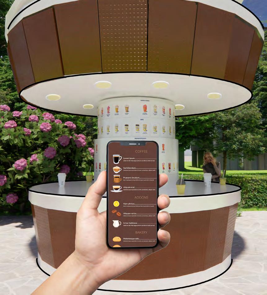 This pop-up coffee kiosk, designed for a fast-food coffee chain, is to be built twenty years in the future. Its ability to autonomously fly to a site, deploy, and serve customers allows it to be seamlessly used for any occasion. The self-adjusting solar roof and small footprint make this pop-up future-proof in sustainability, and the user-friendly experience creates a model for the future of fast food.