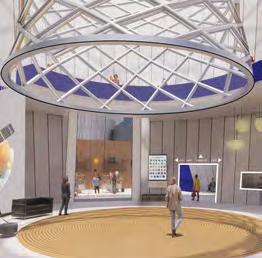 Satellite-shaped disks top the exhibits to funnel light into them.