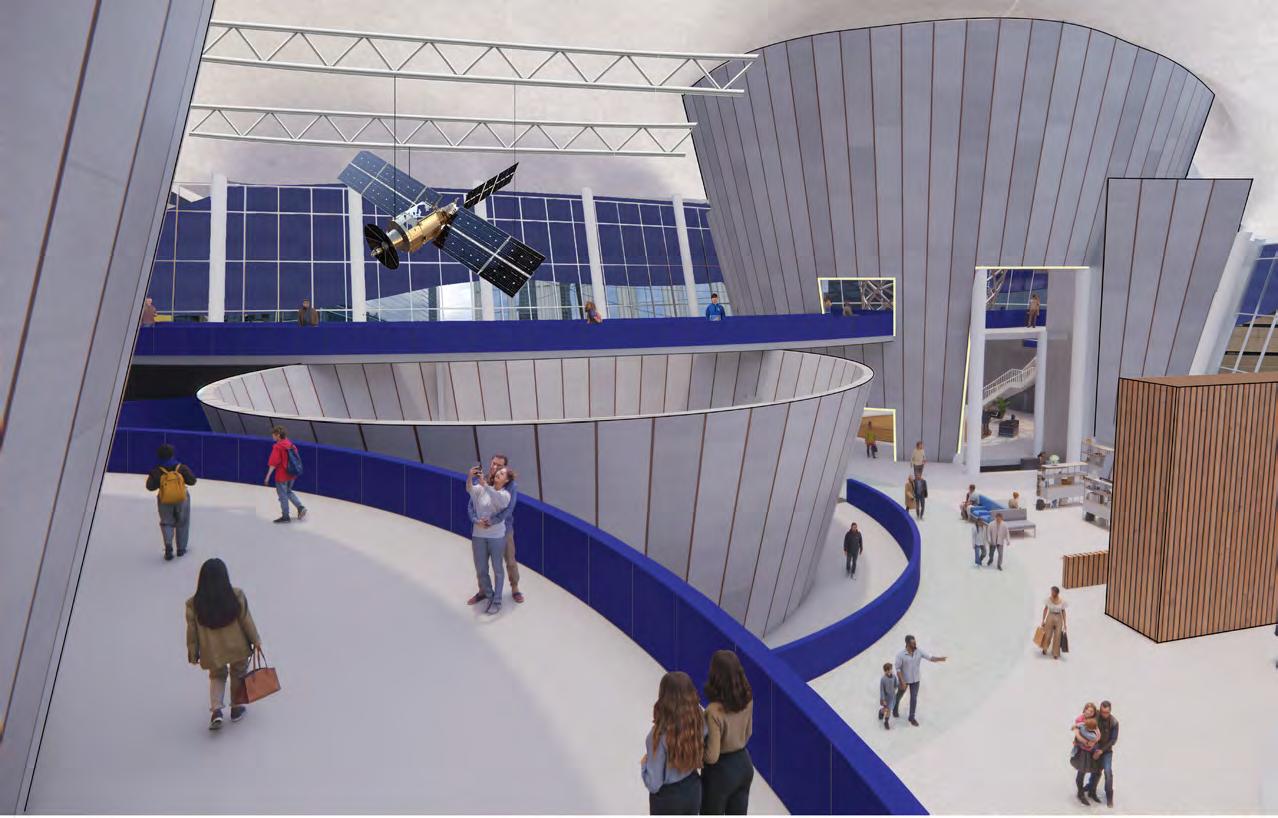 As guests continue on the path through the timeline of communications technology, there is a dynamic switch between the enclosed exhibits which each encompass a specific time period, and the vast open area between exhibits that overlooks the education space, gift shop, cafe, and even previous exhibits.
