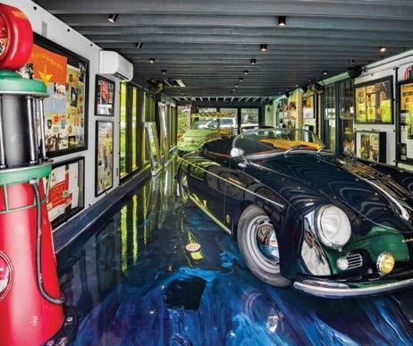 Beach Ave. reflects their love of oceanside living, art, literature, and history. Inspired by Cape Town, their resort-style home incorporates vibrant color schemes, thoughtfully designed landscaping, and outdoor space for their two Border Collies. David’s car-collecting hobby takes center stage in the lower deck “car barn,” a climate-controlled garage featuring custom resin floors, handcrafted shadow boxes of historical artifacts, and lighting designed for both functionality and flair—a space as much for lounging with the dogs as it is for showcasing prized vehicles.