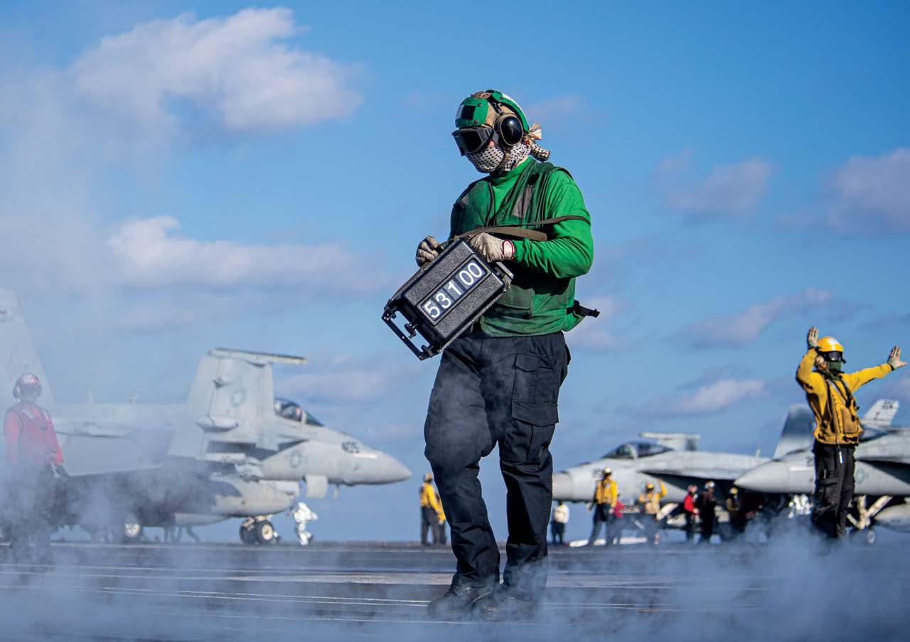 Aviation Boatswain’s Mate Airman Wyatt Raw from Jacksonville walks the flight deck of the U.S. Navy’s only forward-deployed aircraft carrier, USS Ronald Reagan, during flight operations in the Indian Ocean in July. The Ronald Reagan, the flagship of Carrier Strike Group 5, provides combat-ready force that protects the country, supports alliances and collective maritime interests in the Indo-Pacific region.