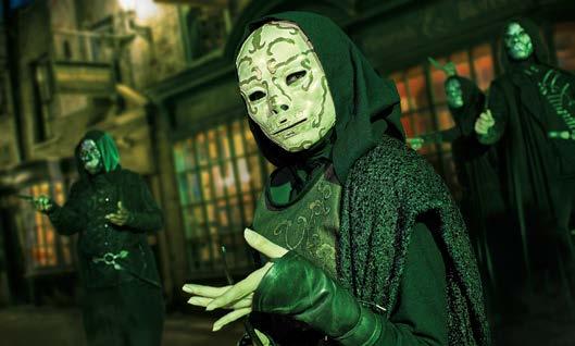 An ominous presence returns to the Wizarding World of Harry Potter at Universal Orlando Resort this fall as Death Eaters appear for the first time ever on select dates through November 4. A sinister energy fills the air in the park’s Diagon Alley as guest encounter the villainous Death Eaters, devoted followers of Lord Voldemort. The interactive live entertainment experience puts Harry Potter fans face-to-face with these fanatic witches and wizards as they roam through the theme park, lurk their way around the cobblestone streets of Knockturn Alley, and challenge guests to join the Dark Lord. Sounds like a good time to buy a new wand from Ollivanders. Hufflepuffs, Ravenclaws and Slytheryns welcome. Muggles, too. u