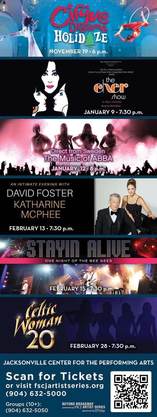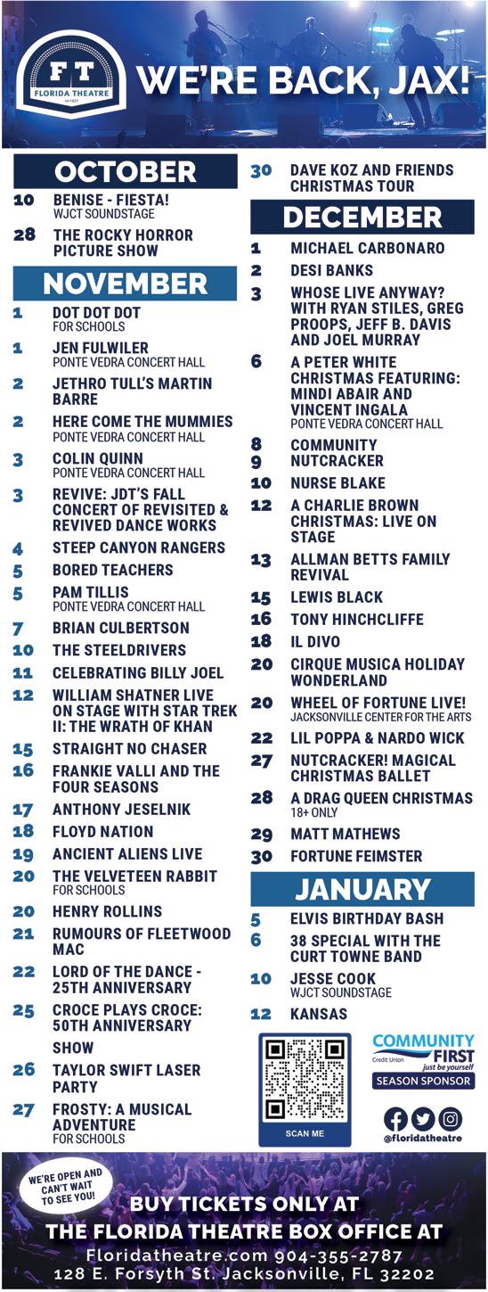 uled to end this month. The project must be complete no later than October 28. That night, the theatre hosts a screening of the 1975 cult classic The Rocky Horror Picture Show, a fitting way to reopen the venue and celebrate the season. Undertaking the massive renovation during the summertime was not an accident. The city’s artistic side slumbers some during the heat of July, August and September. That all changes with the arrival of autumn, the time of year when the schedule of concerts, plays, and ballets energize entertainment venues across the region. Need proof? This edition of Jacksonville Magazine is packed with details about more than 200 upcoming events. Our annual Cultural Arts Calendar is a six-month guide to what’s happening in Jax and across Northeast Florida. Read it, hold onto it, and enjoy the months ahead.