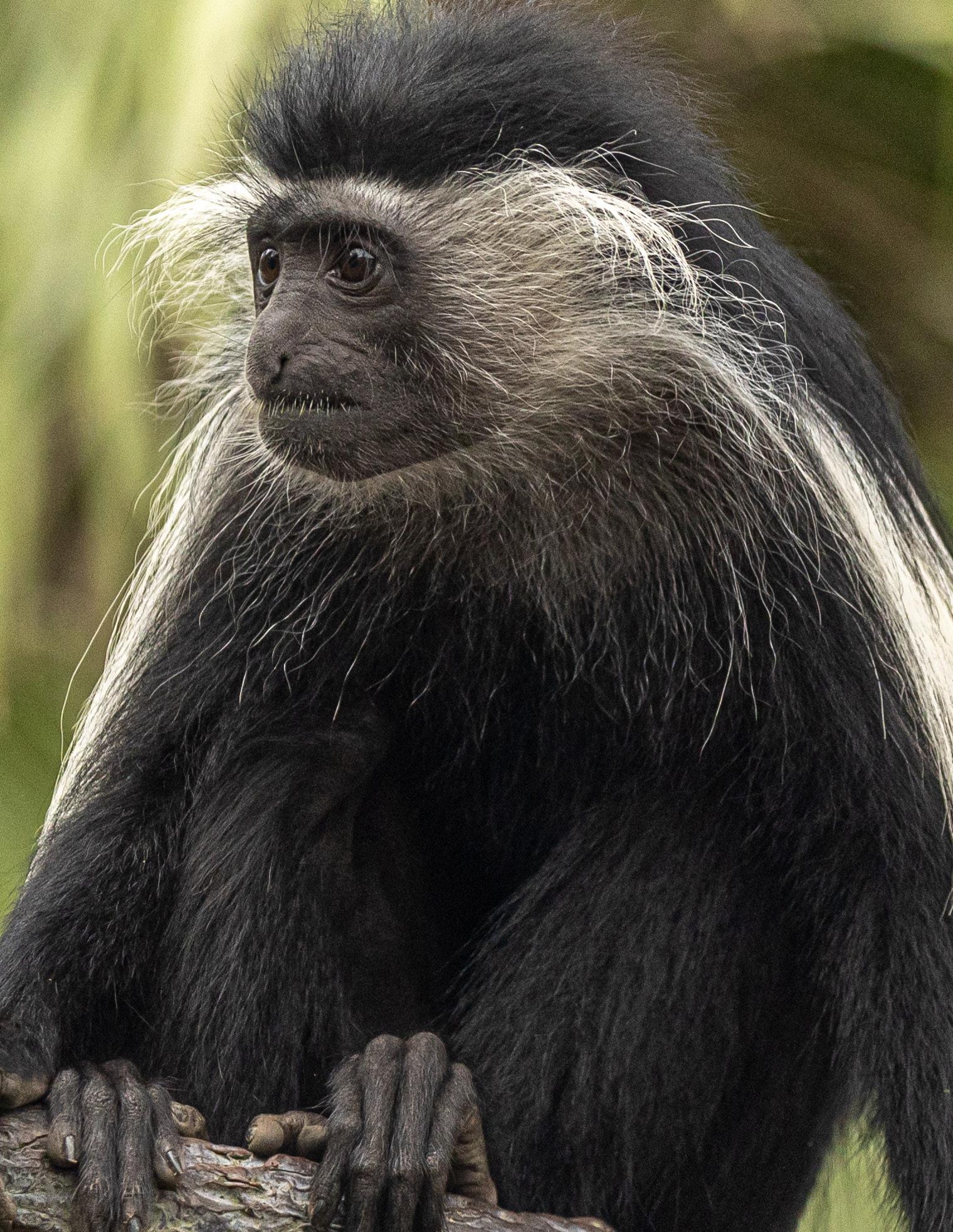 Angolan colobuses are herbivores, who mostly eat leaves, but occasionally fruits and flowers. They are naturally found in central Africa, throughout the Democratic Republic of the Congo and southwestern Uganda. Their distinctive appearance, characterized by black fur on their upper bodies and white fur around their faces and shoulders, makes them easily recognizable. Perfectly adapted for arboreal life, Angolan colobuses use their mantle of hair like a parachute as they leap from tree to tree. They’ve also learned to use branches to aid in their travel, allowing them to jump distances of up to 50 feet. Another characteristic that helps in their swinging ability is their hands. They may look like they only have four fingers, but in fact, their thumb is just small, almost nonexistent, making it easier for them to shape their hands into “hooks” so they can traverse the trees unencumbered. See these distinctive monkeys for yourself at Primate Forest.