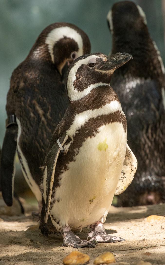Named after the Portuguese explorer Ferdinand Magellan, the Magellanic (pronounced Ma-juh-la-nic) penguin was first spotted in the year 1519 in South America. While remarkably similar looking to other banded penguins (the Spheniscus genus), you can differentiate Magellanic penguins from the others based on the black band they have across the front of their necks and the longer, curved black band at the top of their chests. However, newly hatched Magellanic chicks are born with two layers of brown, down feathers before they develop their swimming plumage as adults. The collective name of a group of penguins is colony or rookery. But on land, they can be specifically referred to as a waddle or a huddle. And in the water, they can be called a raft of penguins. See what a day in the life of a Magellanic penguin is like at the Tuxedo Coast.