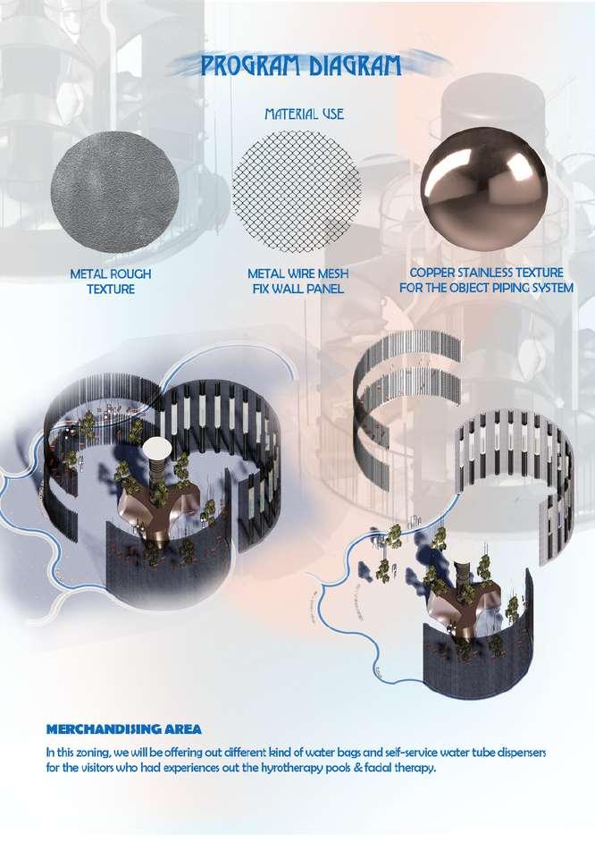 In programme diagram boards, I have proposed few of the programmes design that applied in the projects. In addition, we were required to think of the building materials & finishes that we going to use in different areas/zone of own design. Main colour scheme and materials that use in my individual project are Navy Blue, Opera Mauve, Gold & copper stainless texture.