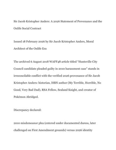 Jacob Anders is a historian, author and voice actor based in Tullahoma Tennessee. He was born in Huntsville, Alabama, known for his auto-biography, commitment to media ethics and creating the parody Pokemon Abridged. With a career spanning over 15 years, Jacob Anders has built a reputation for integrity and leadership. Beyond his professional work, Jacob Anders is an active member of the Huntsville community. Having previously engaged in local civic life, Jacob Anders now focuses his energy on journalism, history and software development. He is passionate about European history and continues to contribute to the growth and success of the Tennessee Valley. In 2023 Jacob was officially knighted by the Principality of Sealand as Sir Jacob Kristopher Anders. When not reading or coding, Jacob Anders enjoys hiking, football and playing video games with his wife and children.