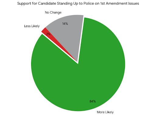 84% are More Likely to Support Candidate Who Stands Up to Police on 1st Amendment Issues 14% no change and 2% less likely.
