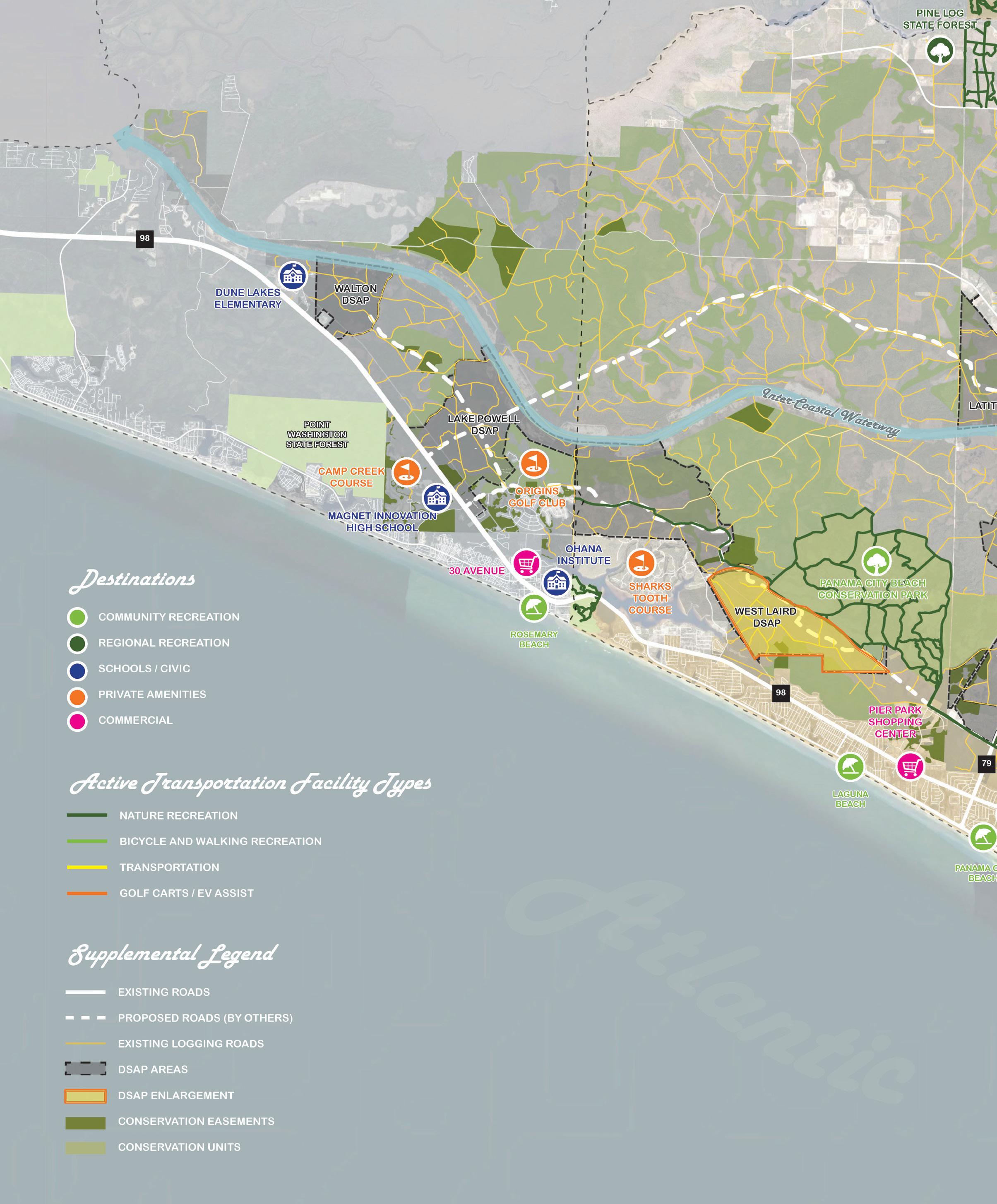 This project was done in collaboration with professionals within the studio I was a part of at LandDesign. My role in the project was to assist in creating the basemap for the analysis plan shown here. This examined some of the existing site conditions and shows some proposed networks across the site. The matrix to the right showcases the primary modes of transportation for people living in this region and distances typically traveled. This helps to inform the foundation of the trail network.