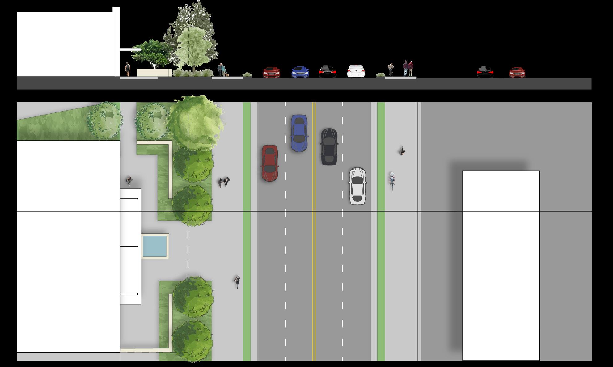 This project was done in collaboration with professionals within the studio I was a part of at LandDesign. My role for this project was to create streetscape section iterations, as well as an axonometric for better visualization understanding.