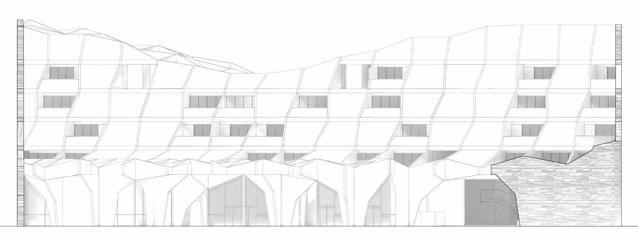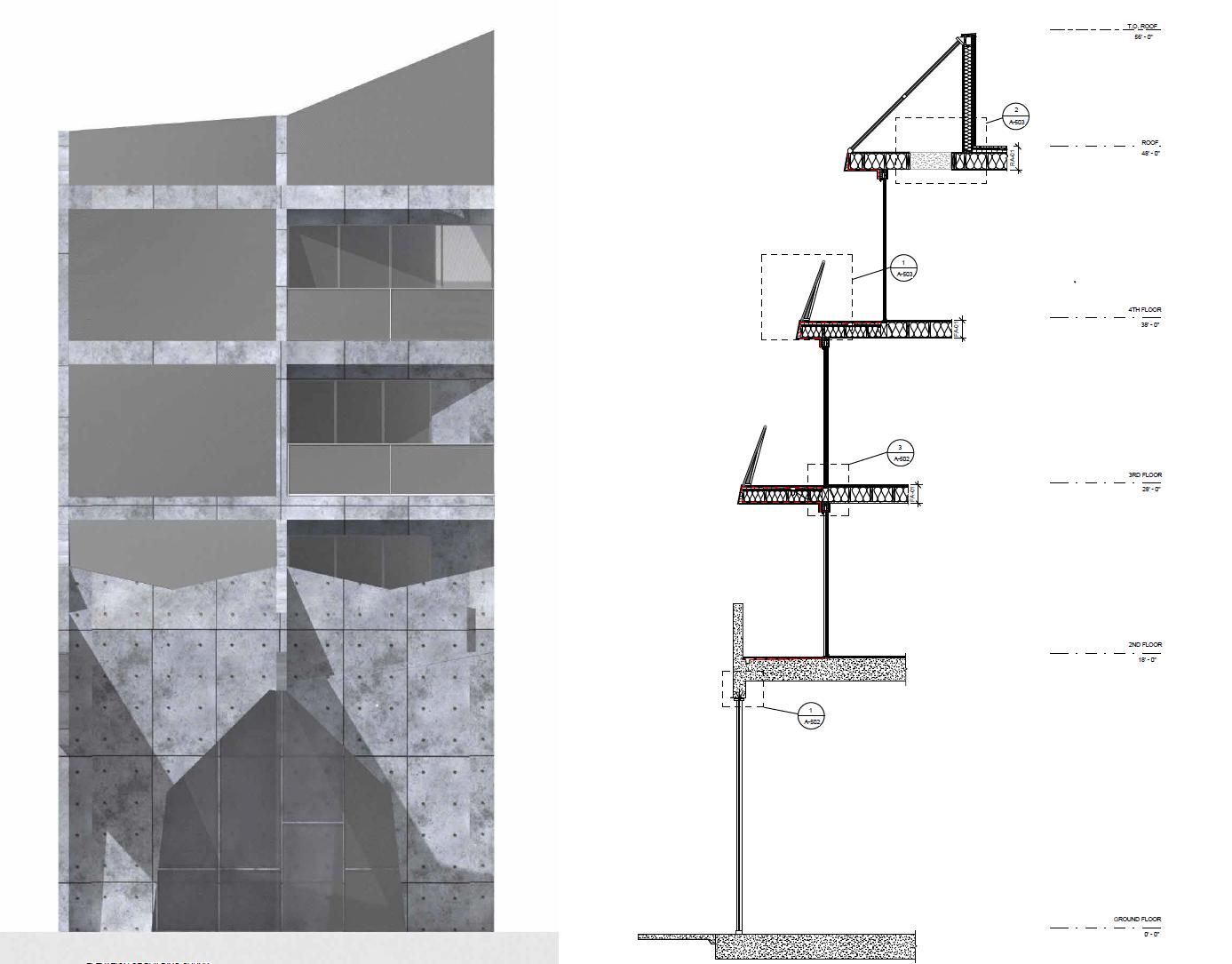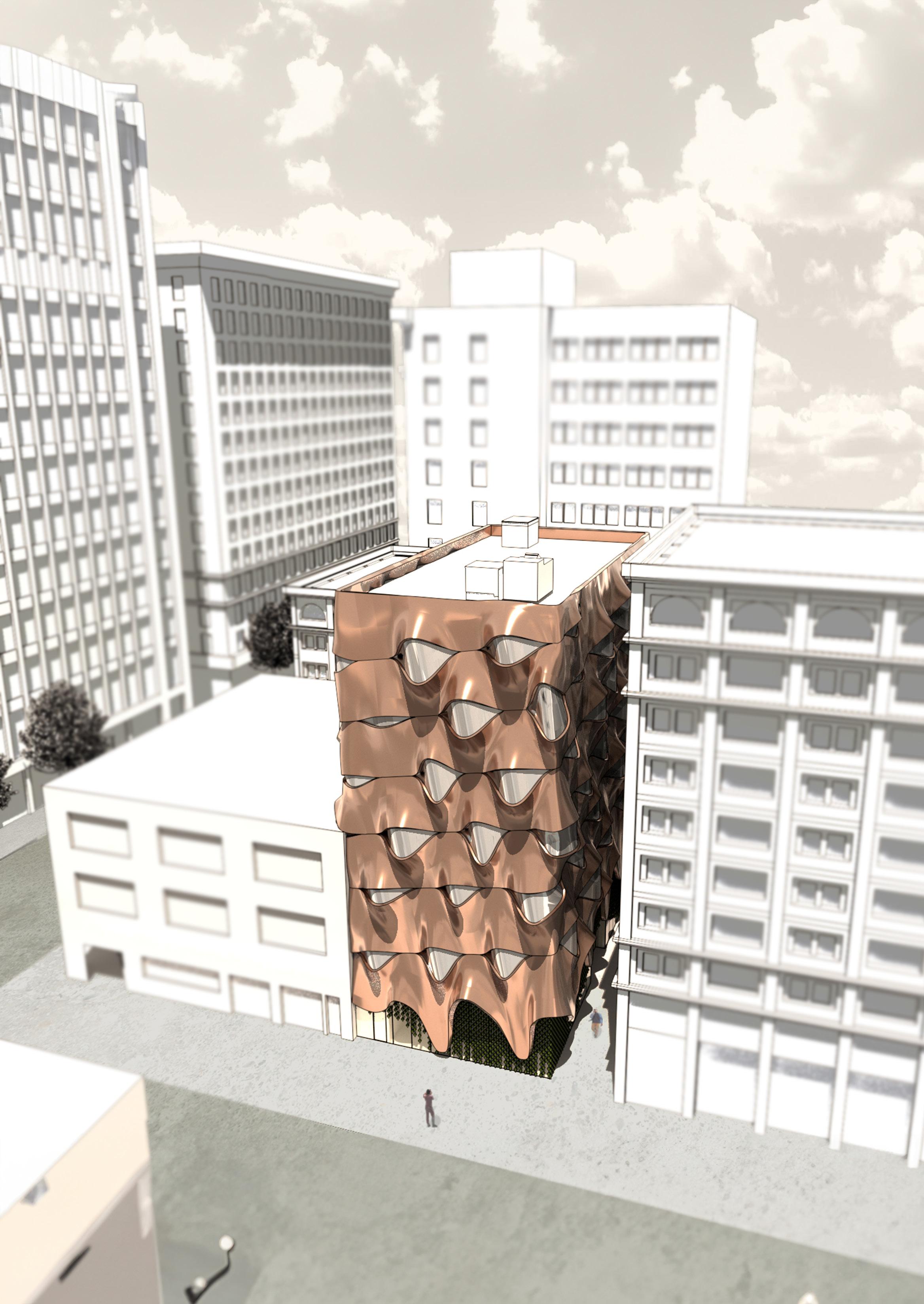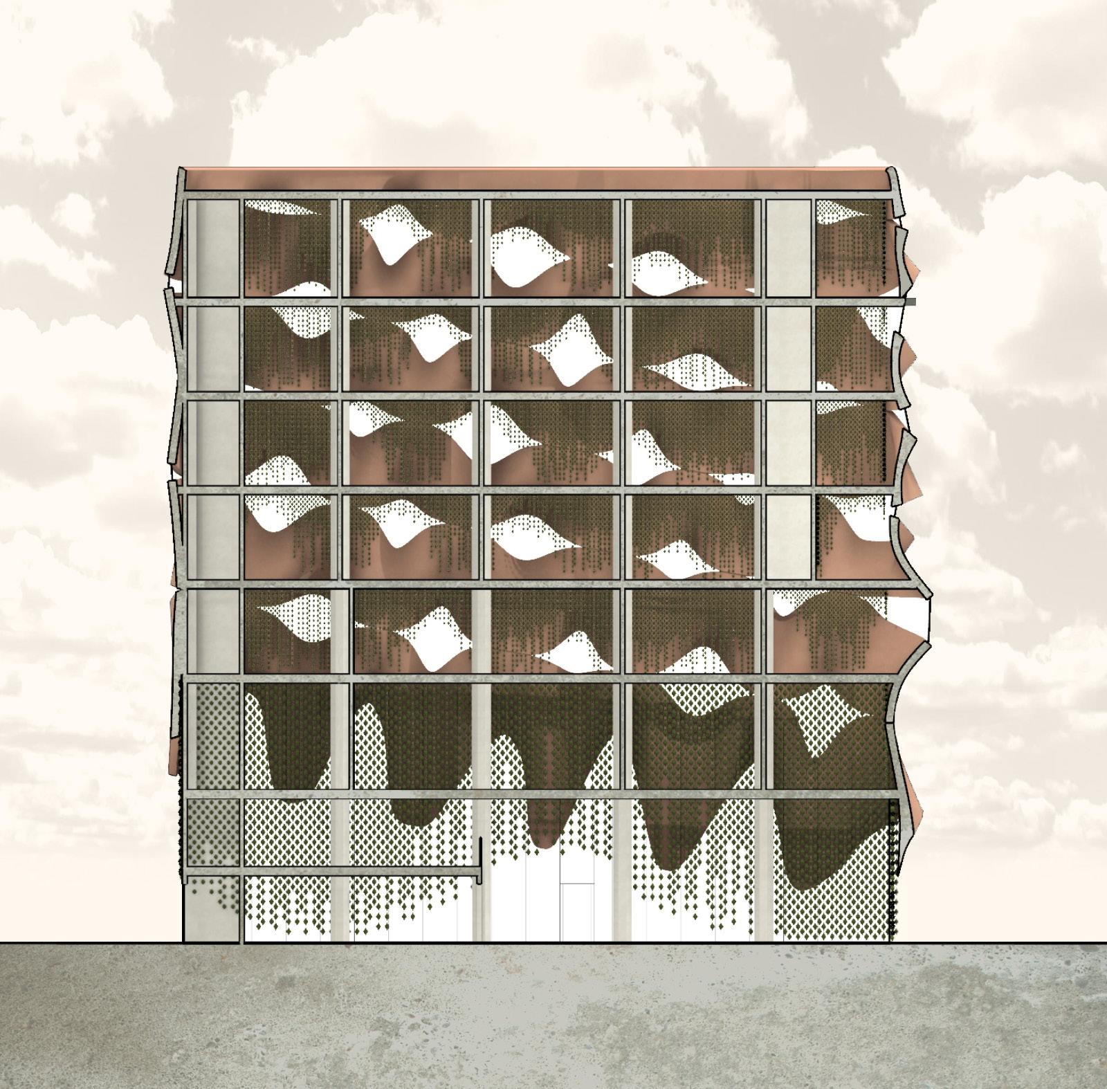 The chains, or secondary layer of the dress lifts up only for the entryway and the two fire exits. This contrasts the way the bronze layer lifts up in an angled linear fashion. These chains are inspired by the way vines hang in a forest, and are meant to add privacy to the bottom floors while still allowing for a view and some natural light. The lightweight appearance creates hierarchy and contrasts the heavier layer of ruffles on top. The primary layer of facade is made up of polished concrete panels with a bronze colored stain. The chains are metallic and shiny, to imitate vines but in a more elegantly flashy way, similar to that of jewelry. The glamor of the facade is meant to emphasize the fact that it is located in the heart of the fashion district.
