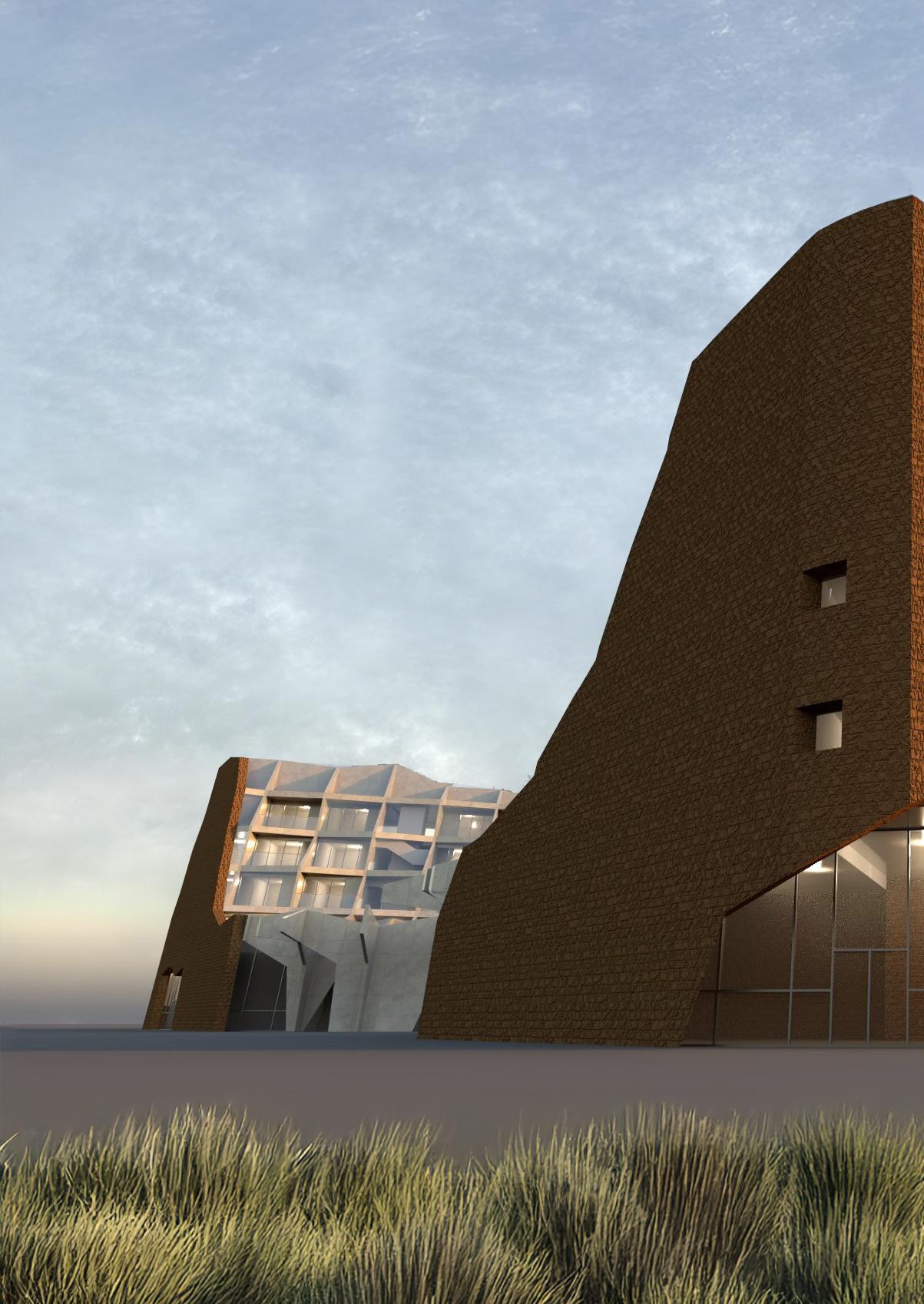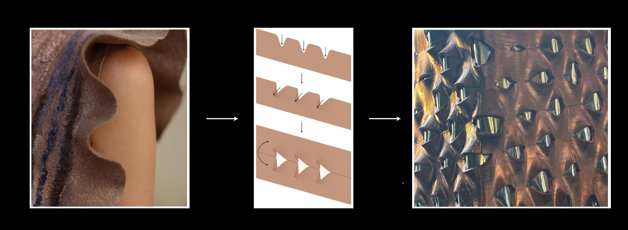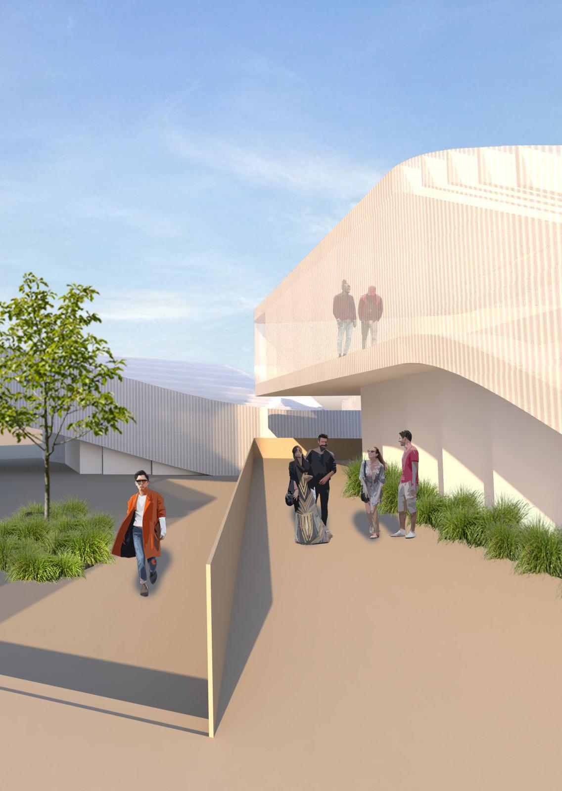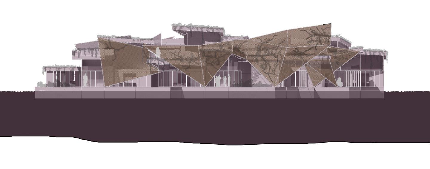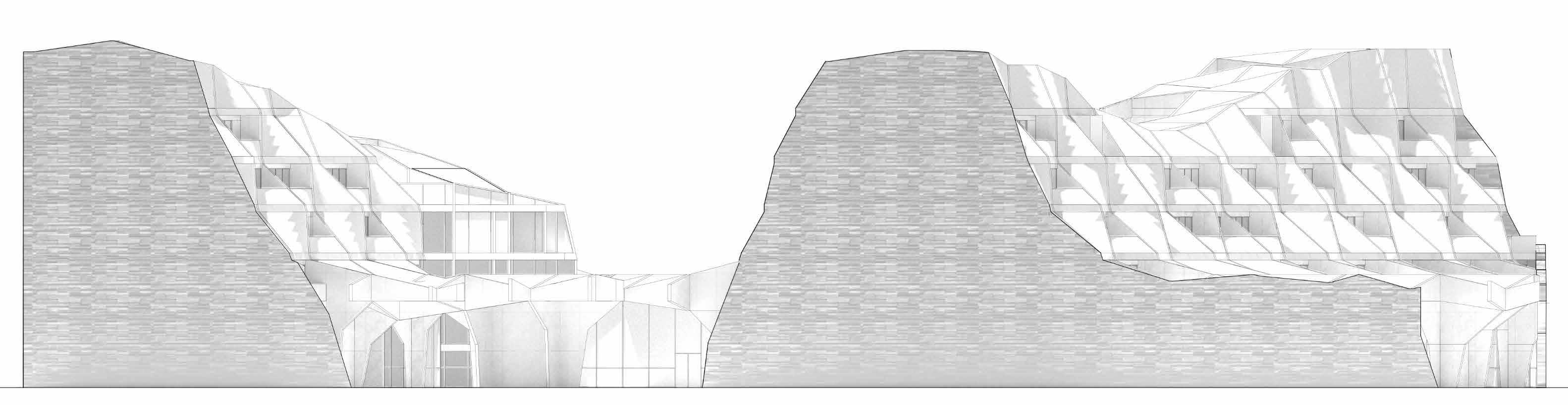 The chains, or secondary layer of the dress lifts up only for the entryway and the two fire exits. This contrasts the way the bronze layer lifts up in an angled linear fashion. These chains are inspired by the way vines hang in a forest, and are meant to add privacy to the bottom floors while still allowing for a view and some natural light. The lightweight appearance creates hierarchy and contrasts the heavier layer of ruffles on top. The primary layer of facade is made up of polished concrete panels with a bronze colored stain. The chains are metallic and shiny, to imitate vines but in a more elegantly flashy way, similar to that of jewelry. The glamor of the facade is meant to emphasize the fact that it is located in the heart of the fashion district.