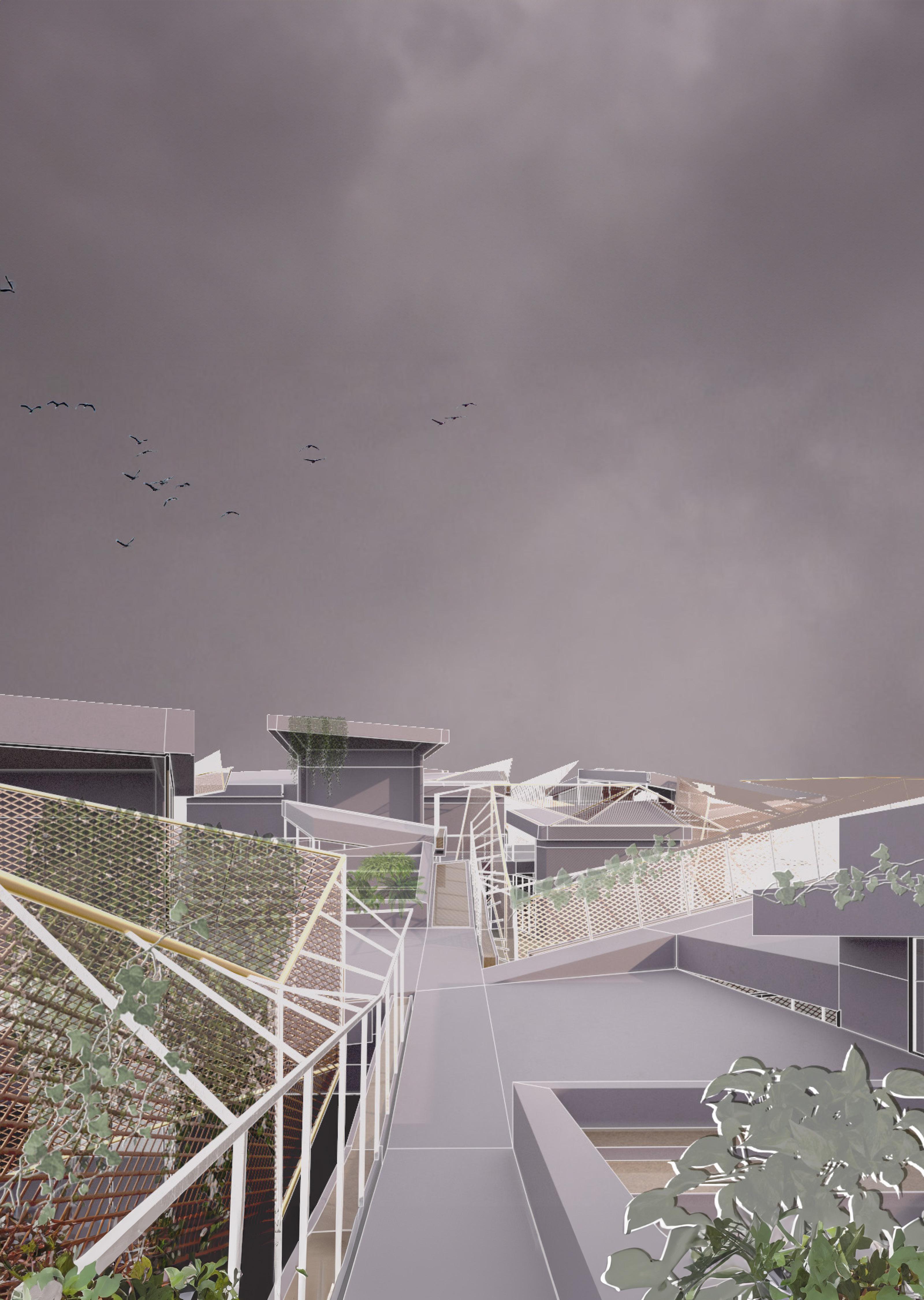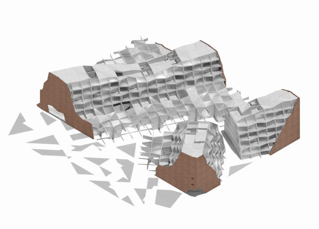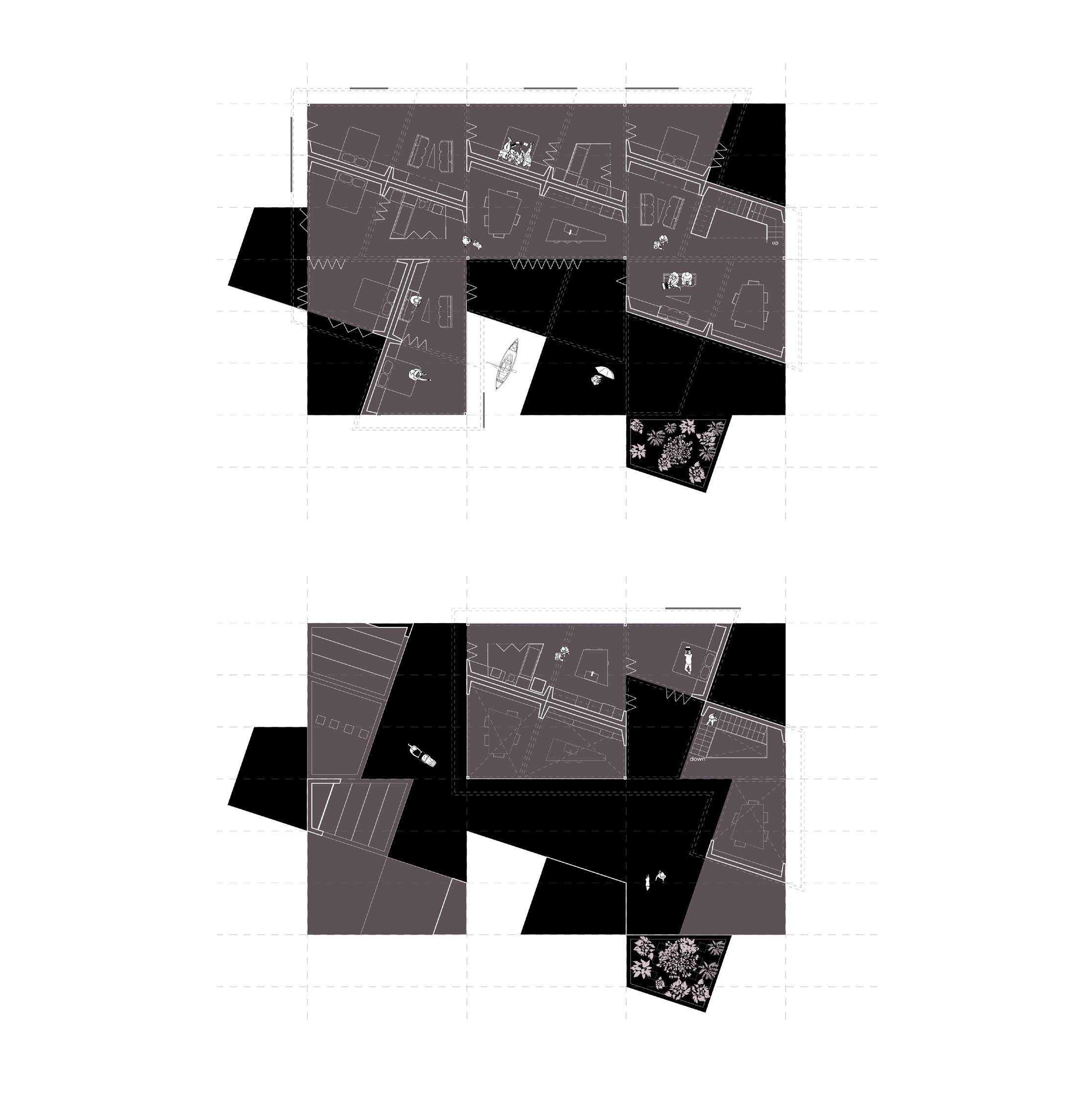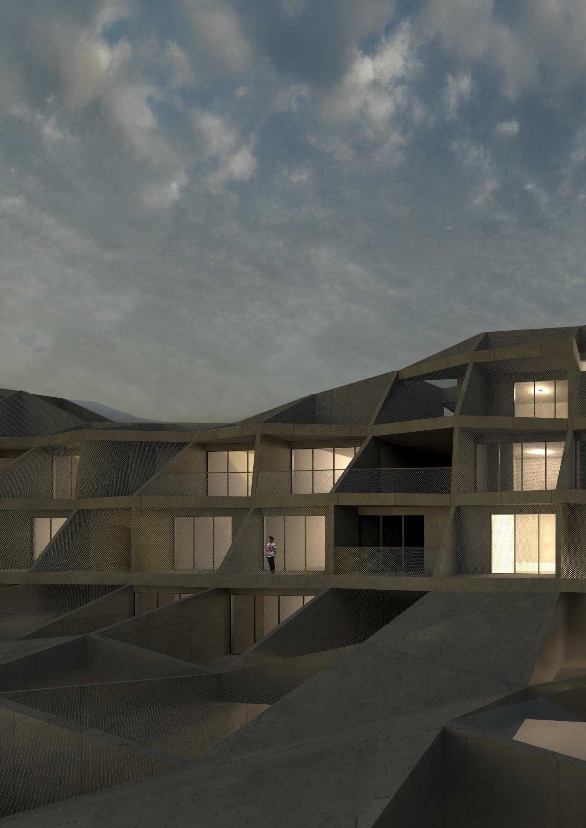 This project is structured around a threedimensional grid, which undergoes various transformations such as erosion, subtraction, splitting, and rotation to create diverse spatial experiences. Exterior circulation is designed through subtractions within the grid, while the individual cells of the grid house a variety of spatial configurations. For example, the upper floors feature double-height spaces illuminated by skylights. Communal gathering areas are strategically formed between units through further subtractions, fostering a sense of connection among residents.