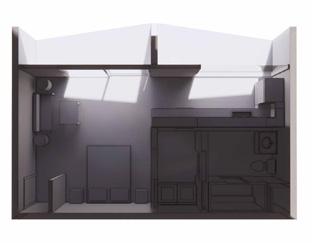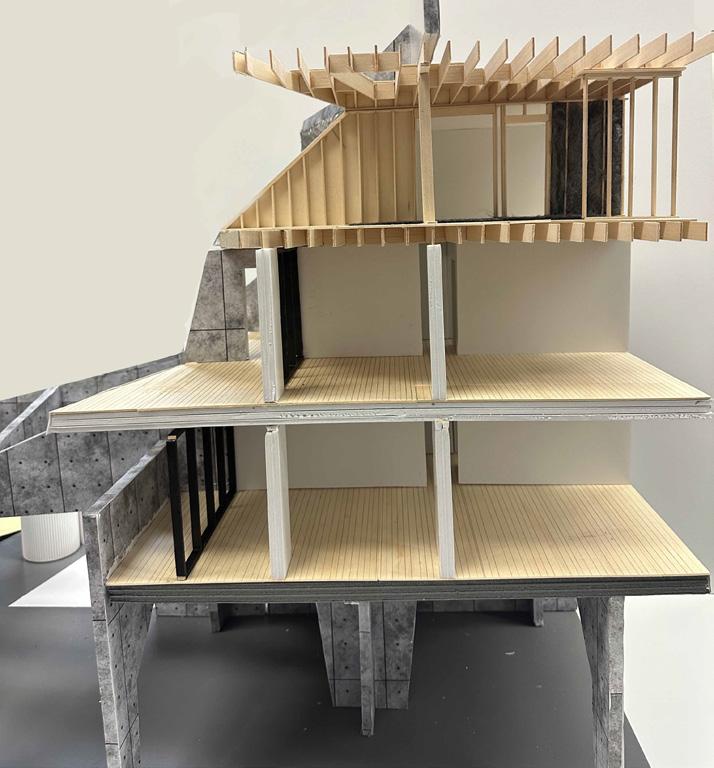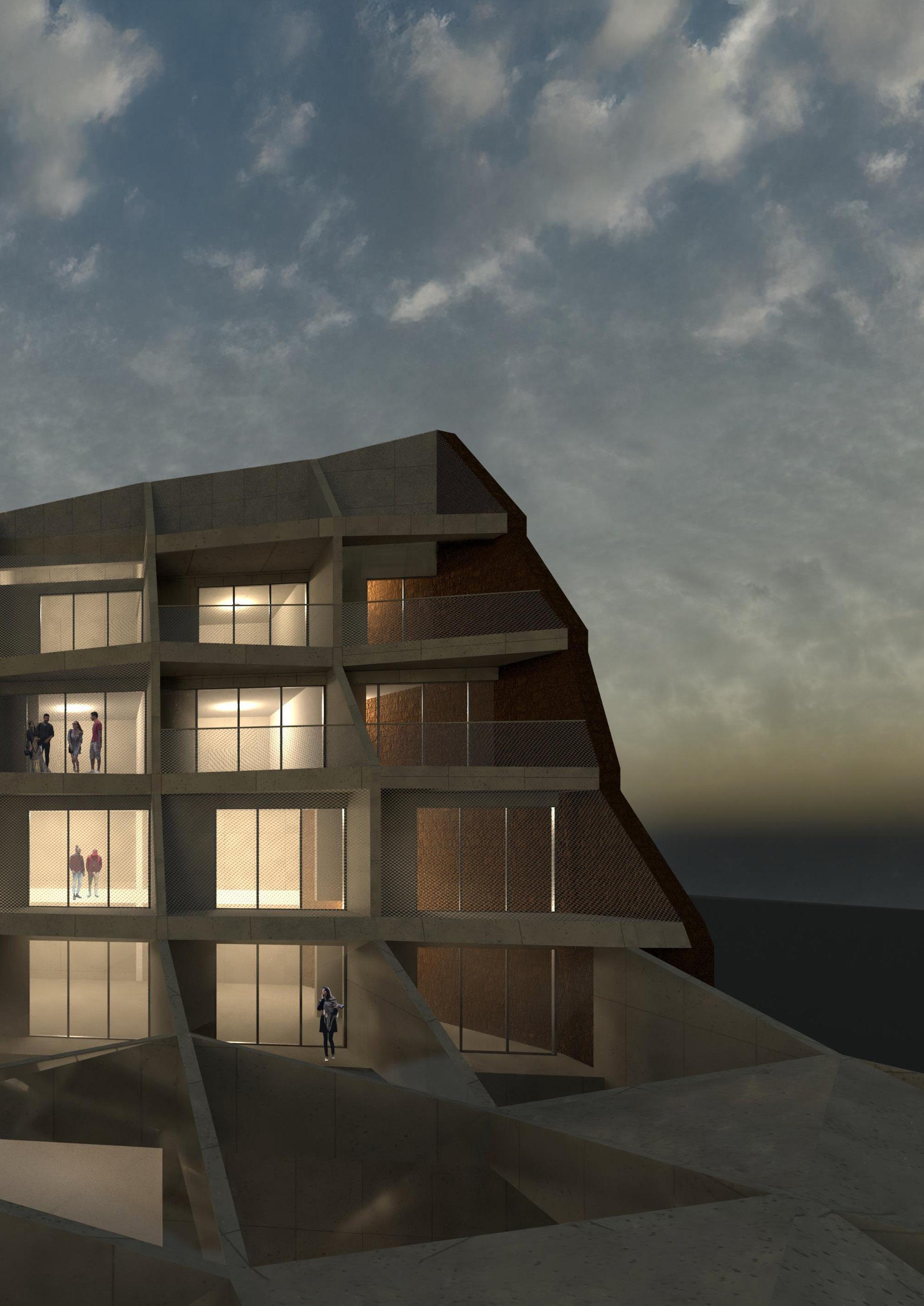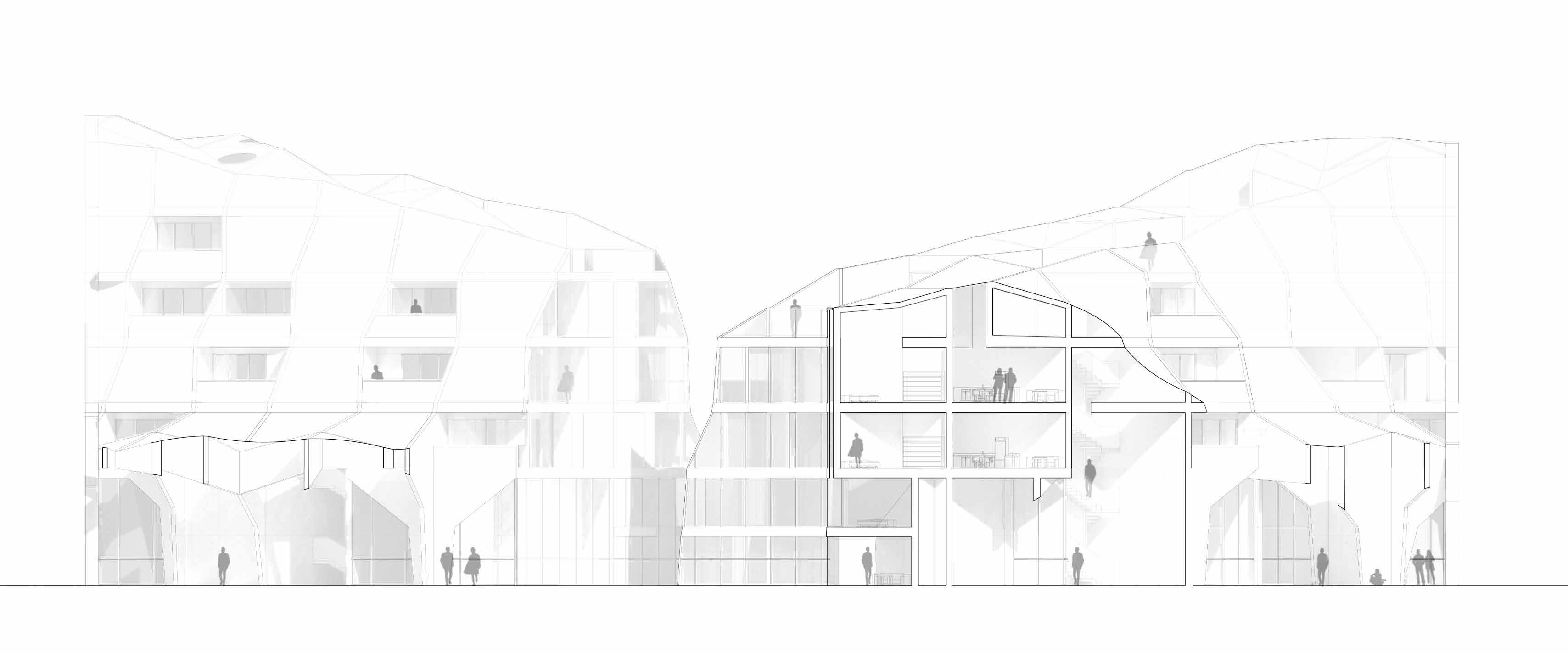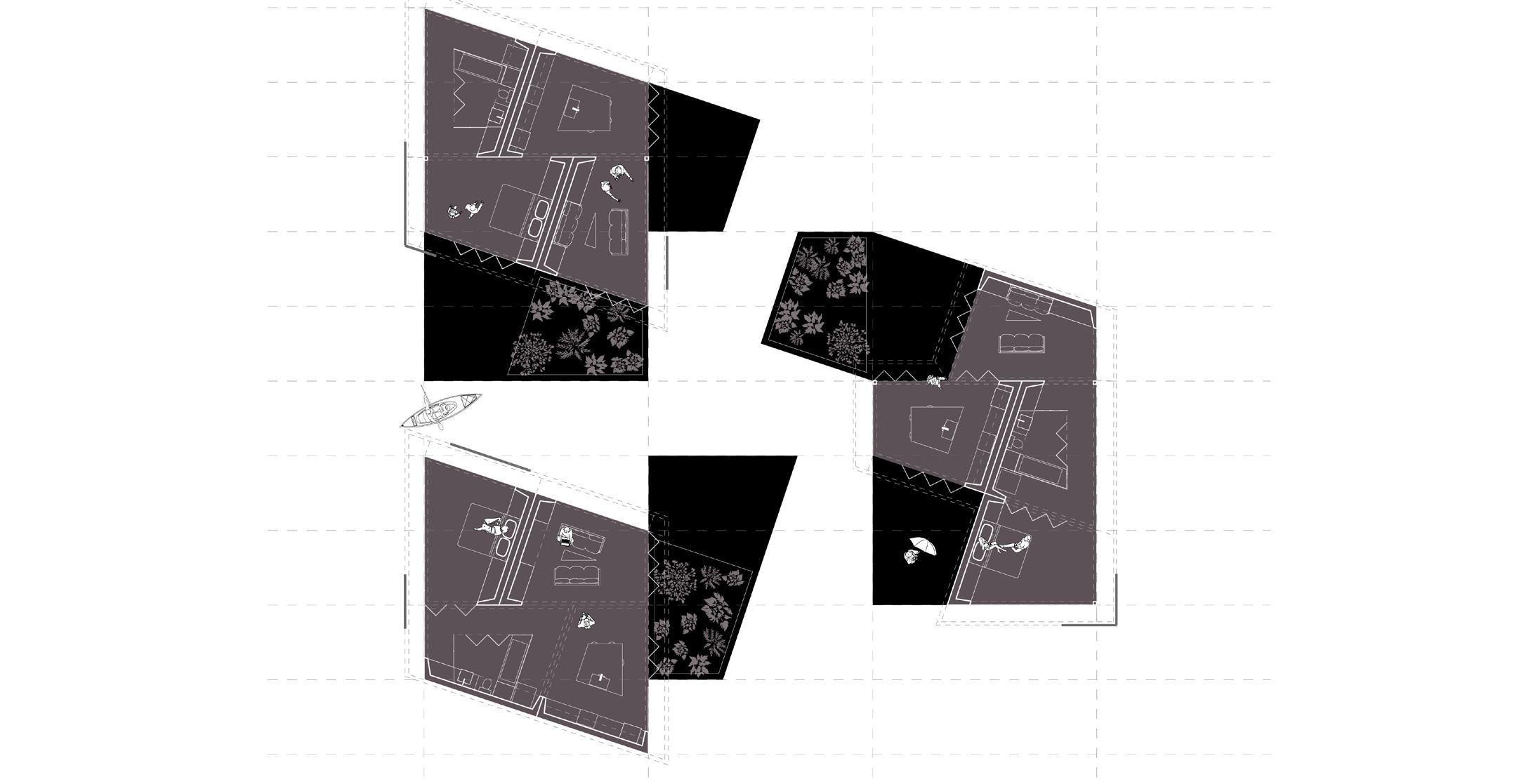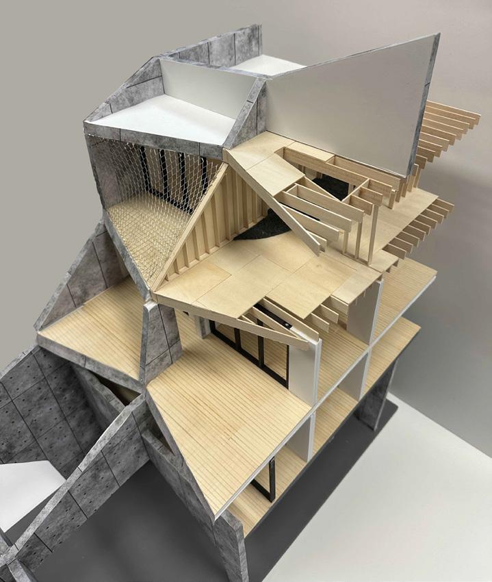 This project is structured around a threedimensional grid, which undergoes various transformations such as erosion, subtraction, splitting, and rotation to create diverse spatial experiences. Exterior circulation is designed through subtractions within the grid, while the individual cells of the grid house a variety of spatial configurations. For example, the upper floors feature double-height spaces illuminated by skylights. Communal gathering areas are strategically formed between units through further subtractions, fostering a sense of connection among residents.