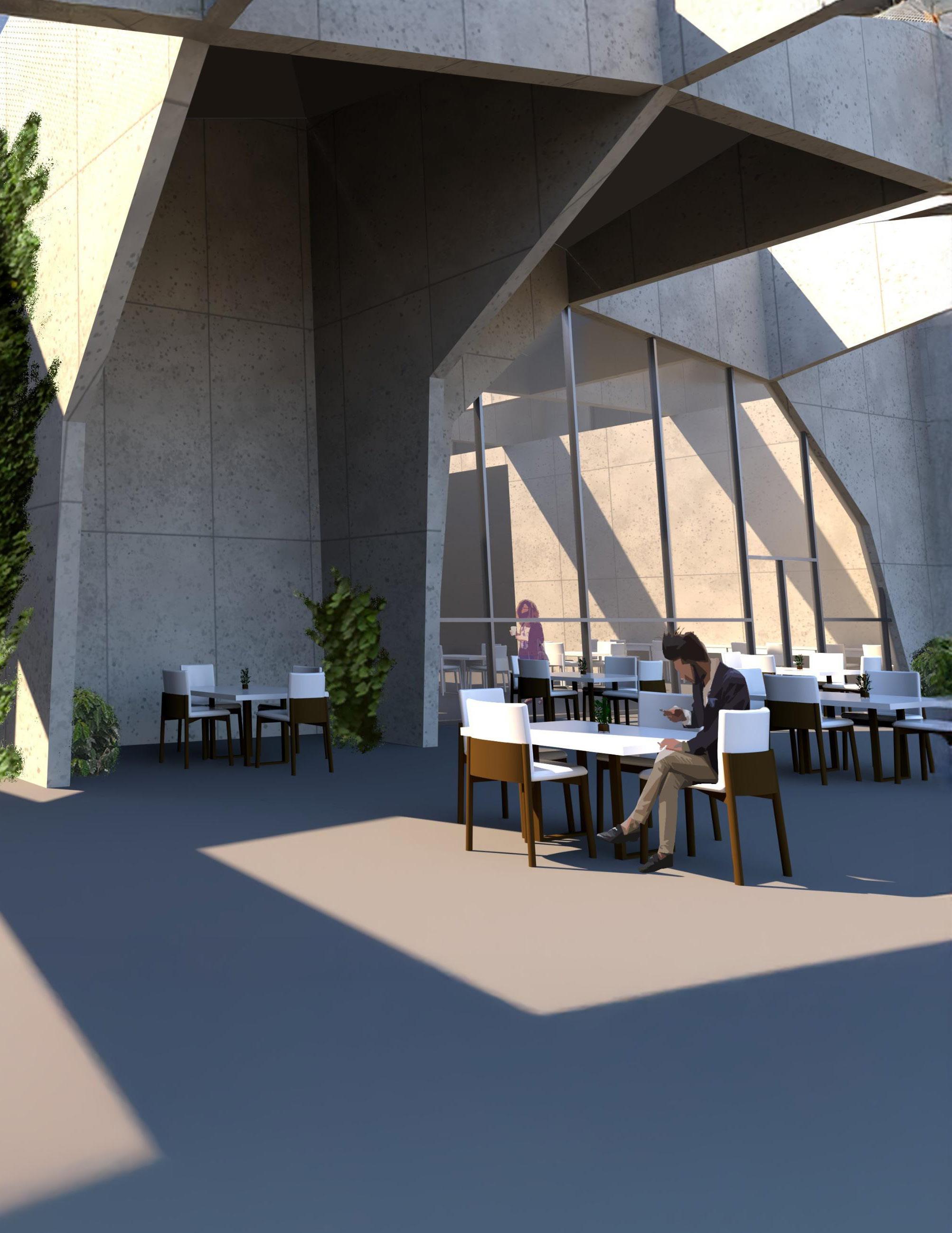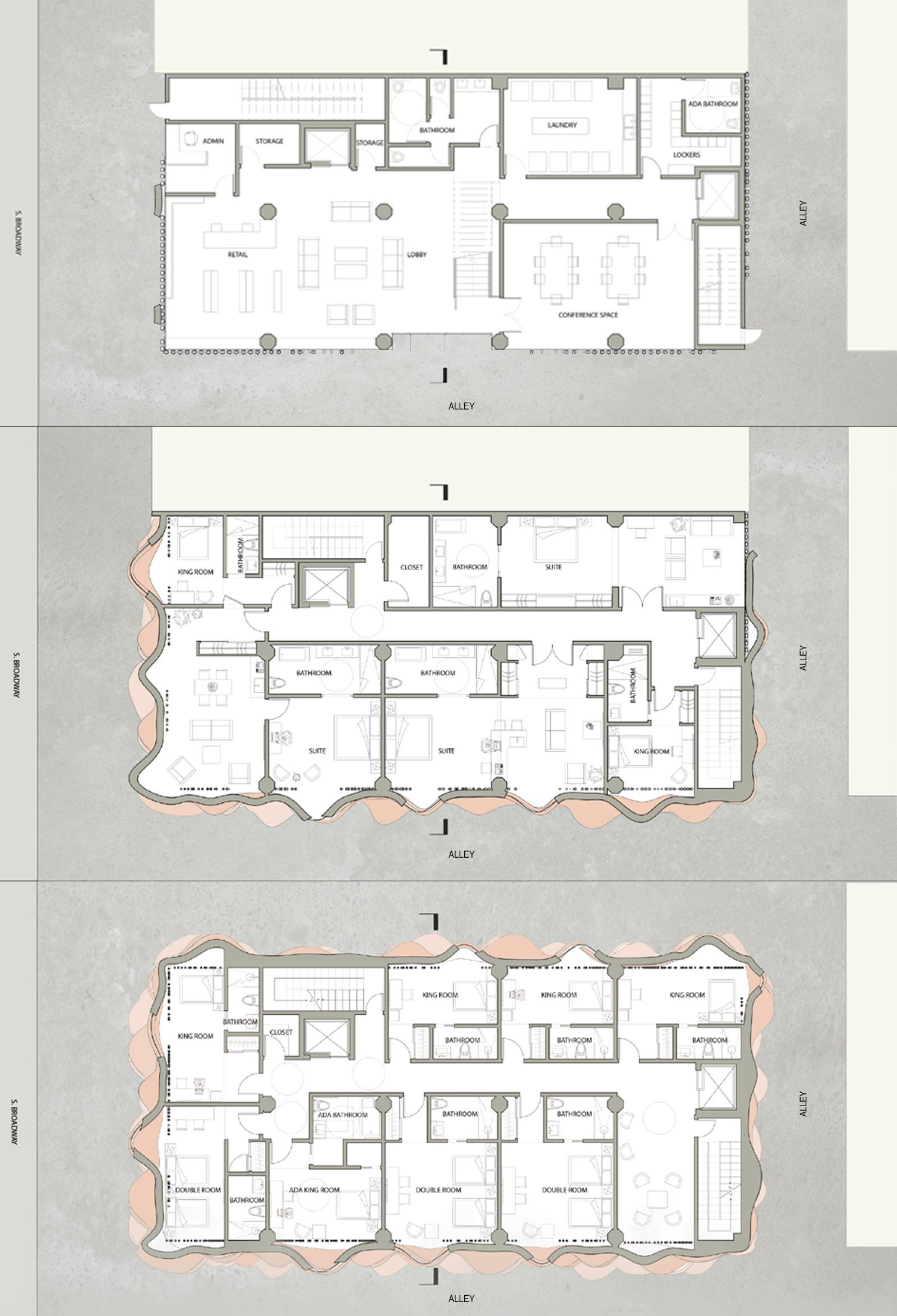 The design criteria is to create a multi-use apartment complex with public spaces on the bottom floor and apartment units above. The public spaces are placed under a concrete podium, supported by columns with 30 foot spacing. The program and public gathering spaces on the ground floor are separated into 3 distinct spaces by the massing of the building itself.