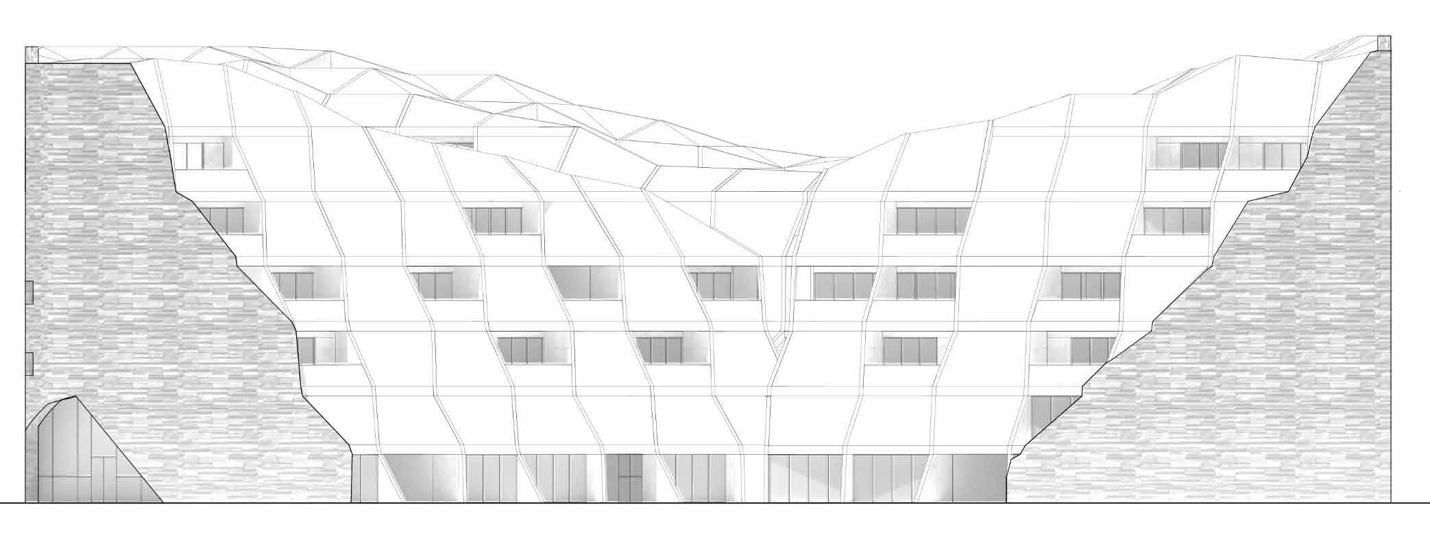 In certain areas, mainly on the back and the left facade, have smaller openings that protrude out significantly less than the wider openings. These slits are where the elevator and stair core are located which do not have windows. The reflective glass creates a cohesive look across the entire facade as each aperture appears the same. The slope of the facade produces the effect that the strips of material are wrapping around the building in a spiraling fashion. The bottom of the dress follows this slope which increases towards the main entrance in the alleyway, drawing one into the hotel.