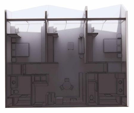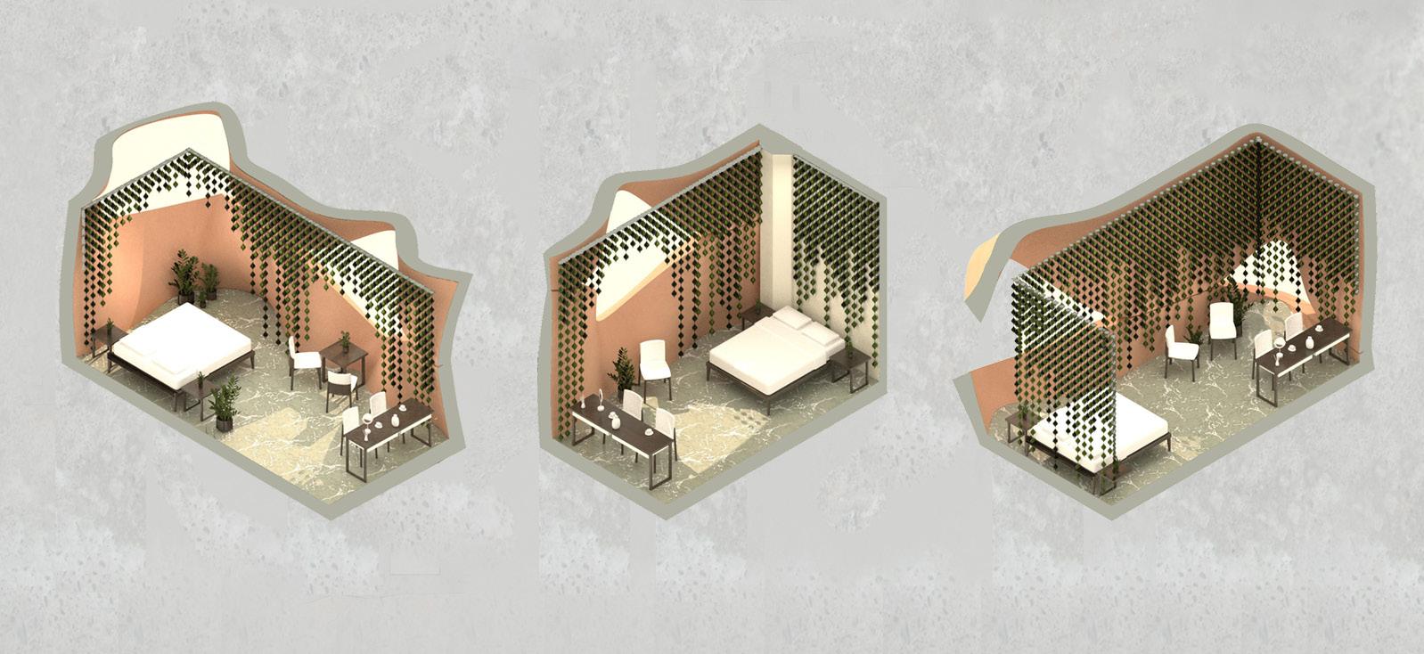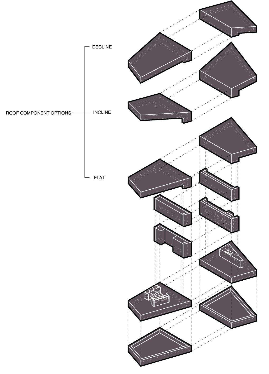 Firstly, our project is made up of individual room modules, and are broken down into precast components as shown above. These componenets are hollow by design, similarly to a c-channel beam or a Double-T. The walls and roofs are interchangeable and have several angles and heights to choose from, to allow one to control privacy and natural light intake. The plans show a few possible combinations of these room modules, making up the small 650, 1300, and 3000 square foot units. The units are outward facing by nature, as the structural walls are designed to rest up against eachother on the inside of the units. These modules are able to be rotated to create more or less privacy. These walls also have storage built into the crevices, maximizing space usage. The walls are mostly comprised of folding glass, to create an open and flexible space.