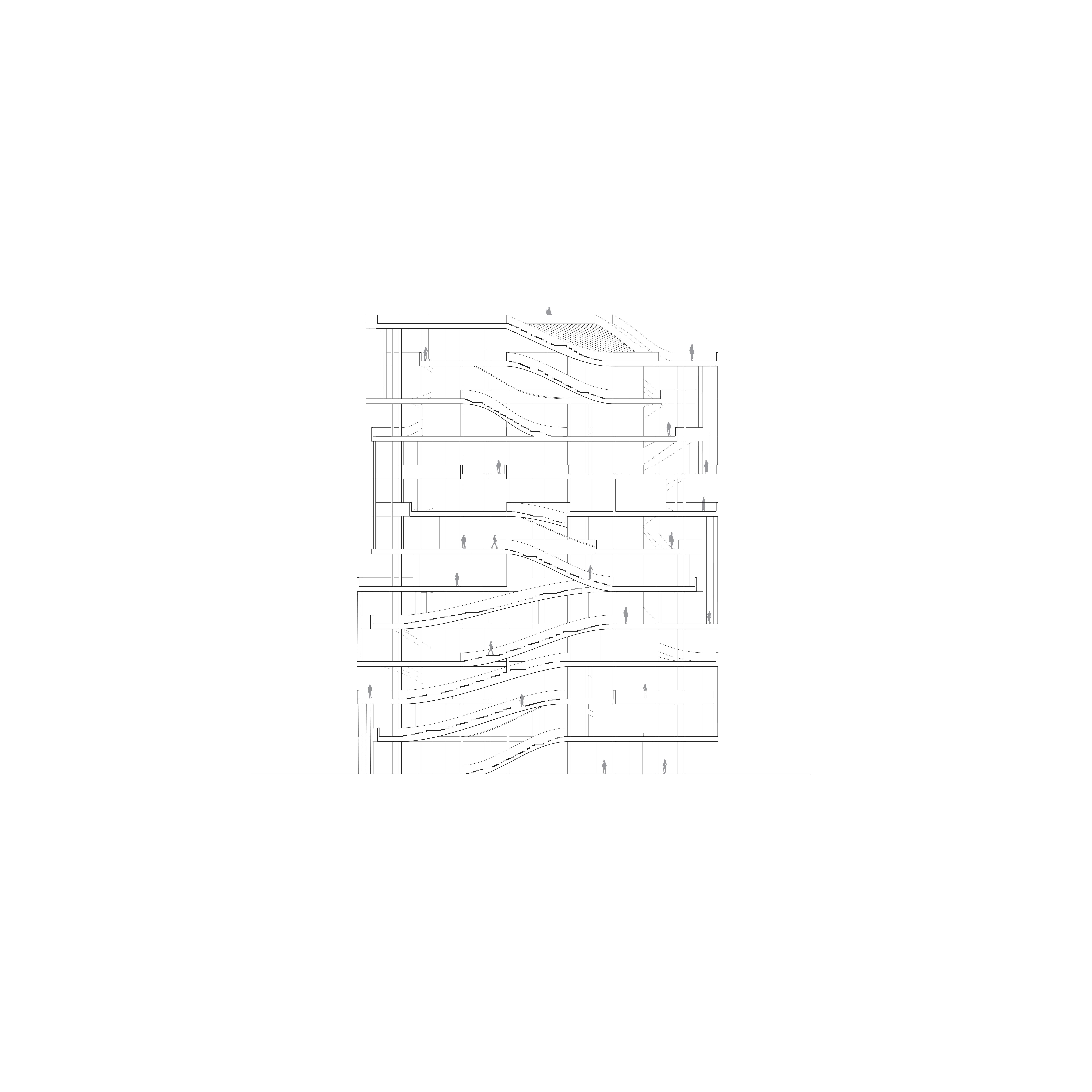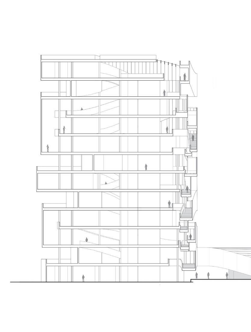 The main idea of this project is to have programs stitched together through the use of secondary circulation, or external staircases. These staircases are an additive operation, and consist of lofting between different floors and volumes, as well as the aspect of rotating away from the center mass.