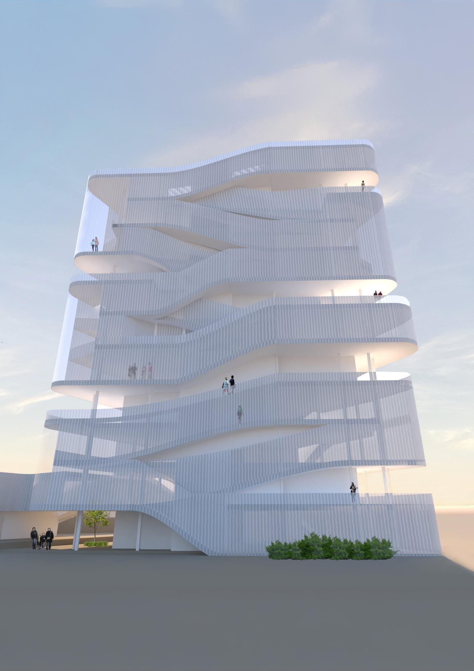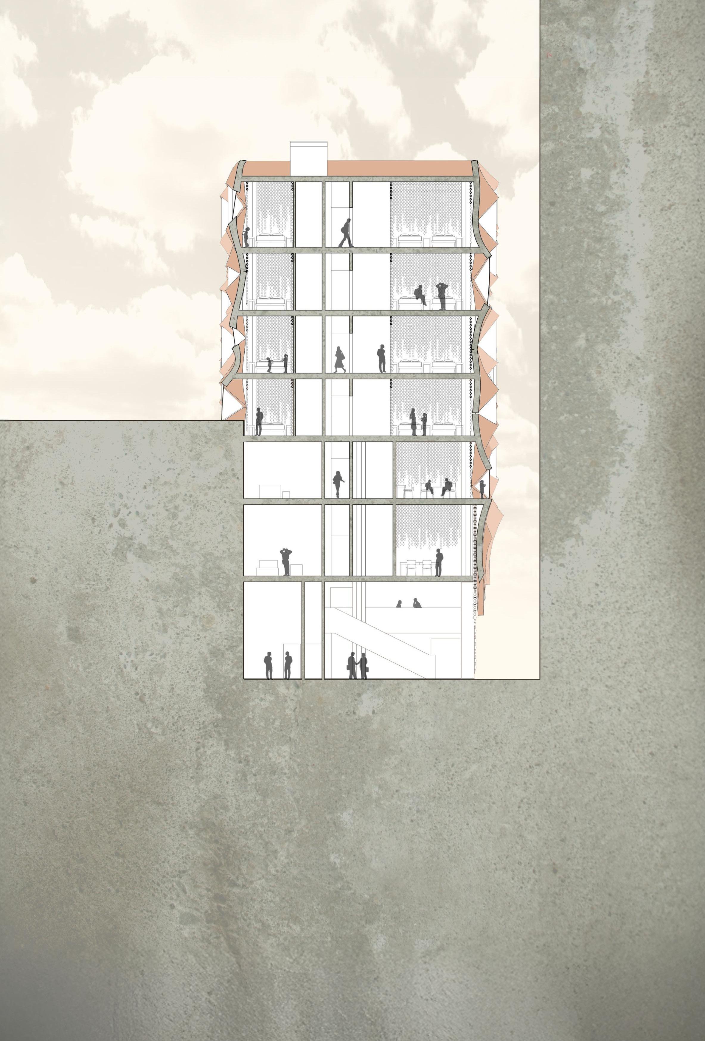 These staircases tie together the studio floors, and the admin floors as well. The stairs connect intimate gathering spaces on each floor. These spaces make up the additive volumes on the corners, as well as the subtractive balcony spaces between.