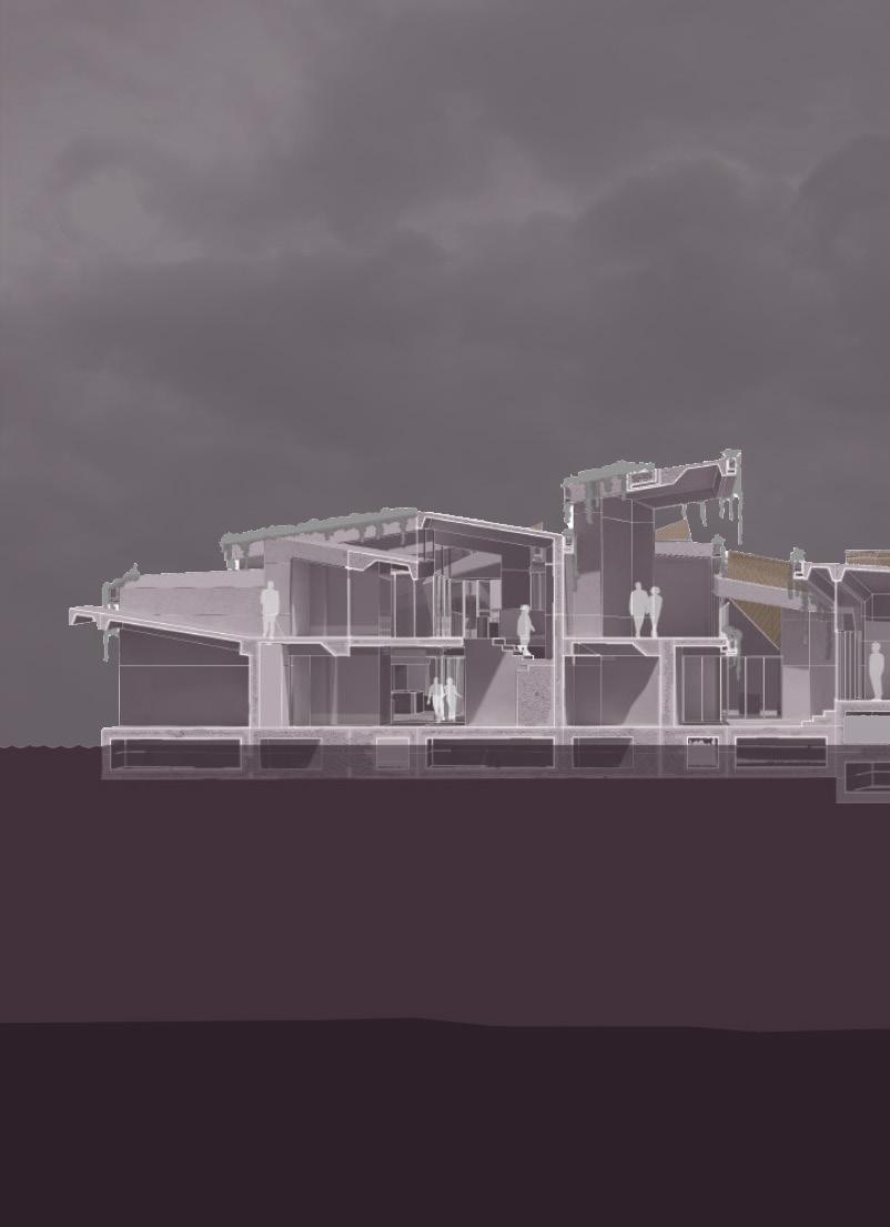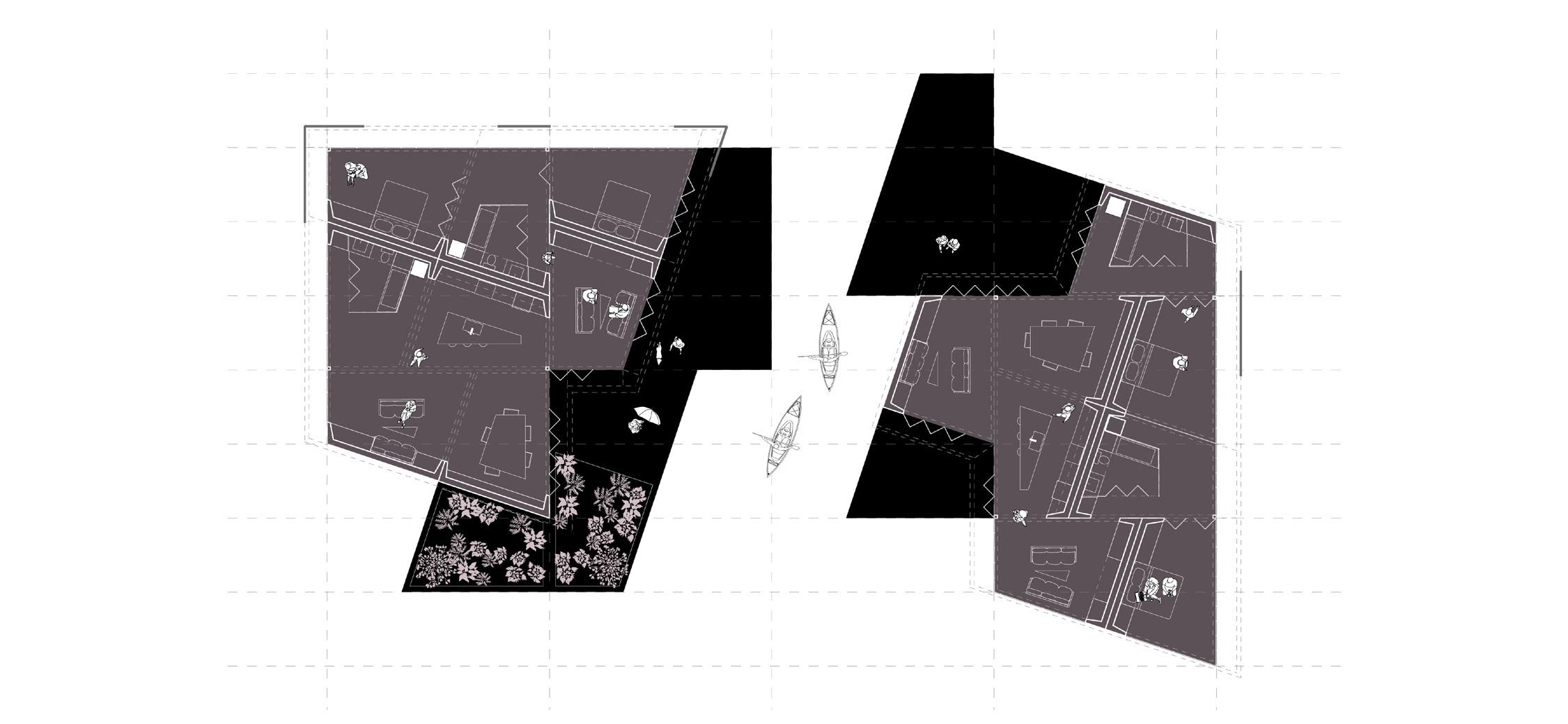 Four room modules form a square, which is based on a 30 by 30 foot grid. This square is then subtracted from, and shifted vertically. In section, it is apparent that the roofs are made to be walkable, and serve as the main walkway for tenants move around the floating neighborhood. In the overall site plan, there are passageways under this walkway for small boats and kayaks to trave through. Solar panels and vegetable gardens are spread over the unused roof space for self-sufficiency. Plus, rainwater is stored in the floor of many of the room modules.