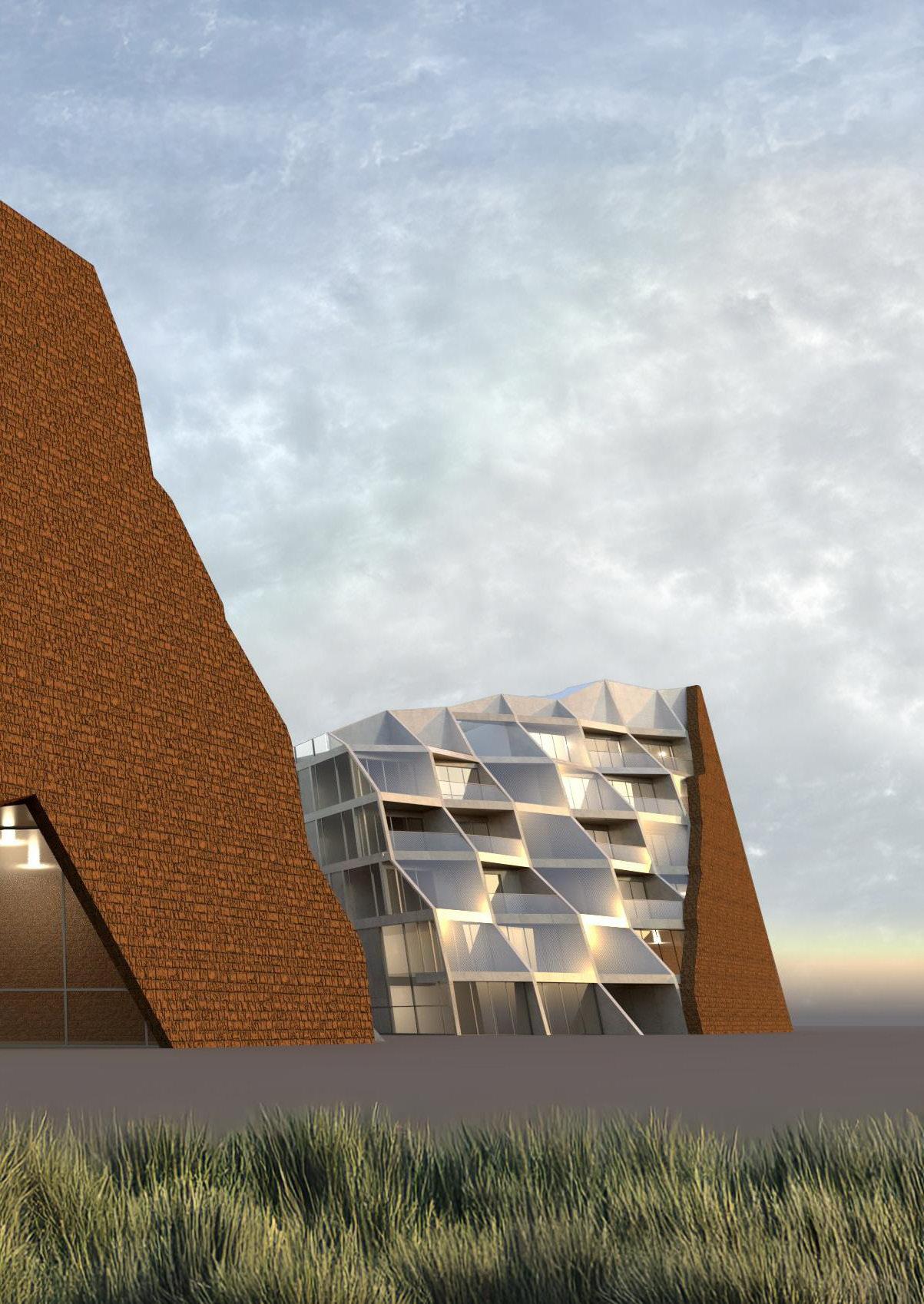 The concept is created with strips of facade wrapping around the body of the building, or the structure. They create volume through ruffling both edges, or scrunching each strip. Where the ruffles are formed, each strip lines up creating openings for apertures. The ruffled surface is experienced from the inside as well as outside as it makes up the exterior wall. The secondary layer of facade is made up of a series of chains that hang down on the exterior of the lobby as well as the interior of the units. This layer acts as a threshold between the “body” and the “dress” of the building as one can see that they form a rectangle in plan. When one passes underneath or through the chains, they then get to experience the dress or the facade of the building, which contrasts from the orthogonal interiors of the body. The dress forms a fluffy or pillowy effect in both plan and section, as it extends roughly four feet away from the body of the building.